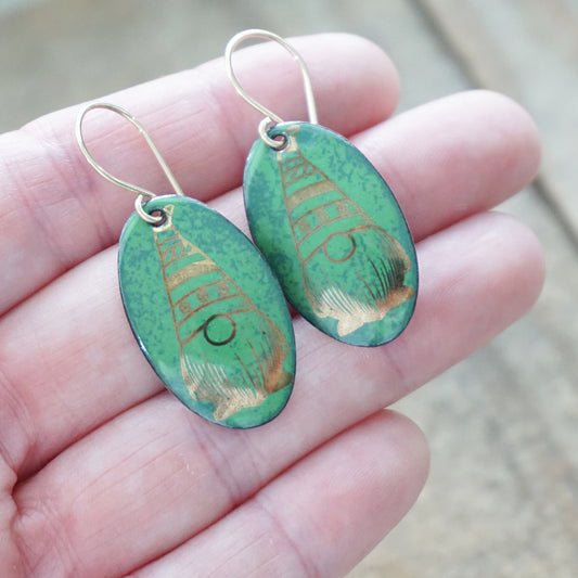 CLEARANCE Gold Gnomes on Green Enamel Oval Earrings