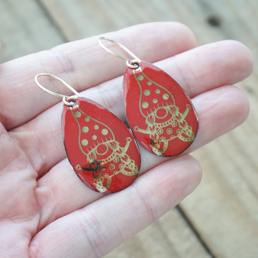 CLEARANCE Gold Gnomes on Red Enamel Teardrop Earrings