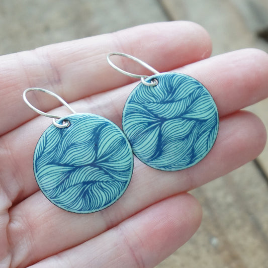 Blue Leaf Accents on Seafoam Green Enamel Disc Earrings