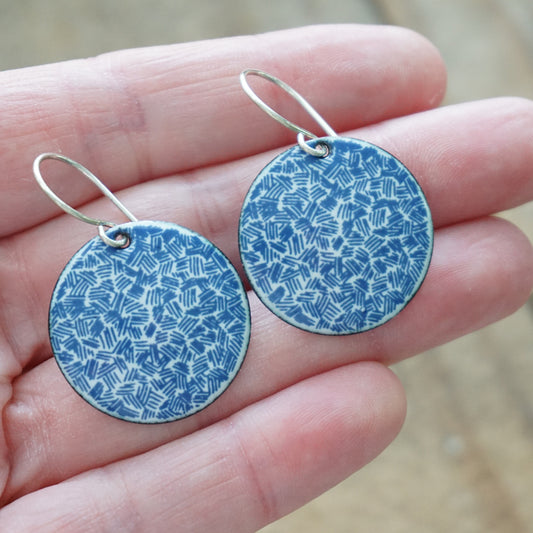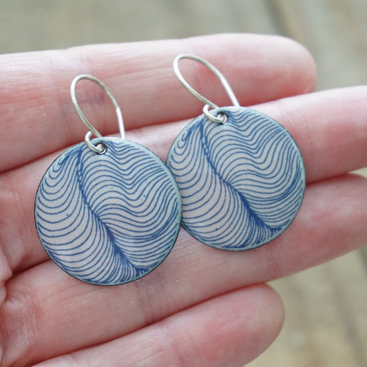 Blue Wavy Line Accents on Light Periwinkle Enamel Disc Earrings