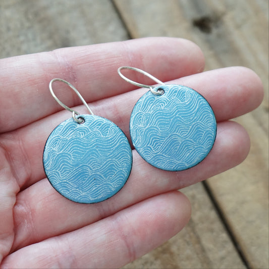 White Wave Accents on Aqua Blue Enamel Disc Earrings