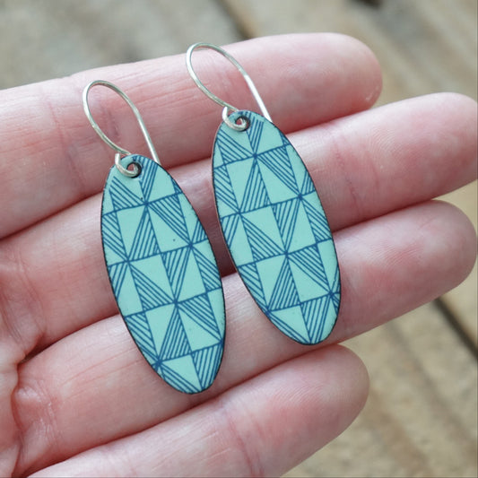 Blue Geometric Accents on Light Seafoam Green Enamel Teardrop Earrings