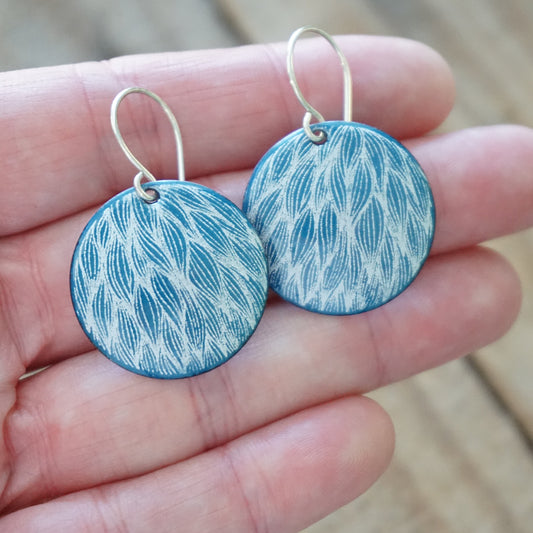 White Leaf Accents on Peacock Teal Enamel Disc Earrings