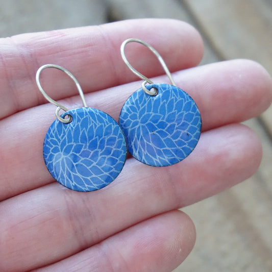 Cobalt Blue Enamel Disc Earrings with White Floral Accents