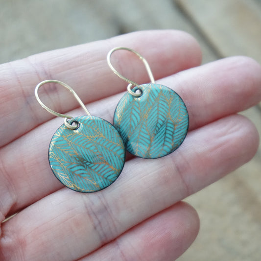Gold Leaf Accents on Teal Green Enamel Disc Earrings