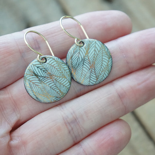 Gold Leaf Accents on Light Seafoam Green Enamel Disc Earrings