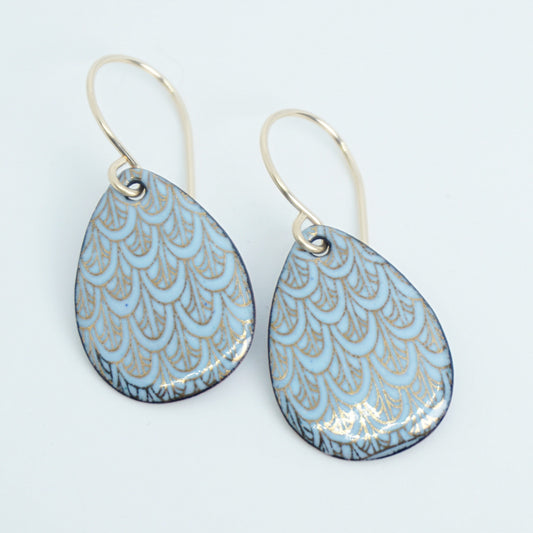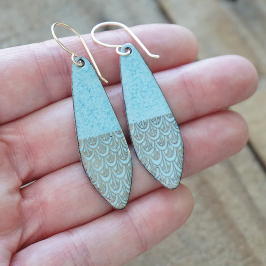 Gold Mermaid Scales on Light Blue Enamel Teardrop Earrings