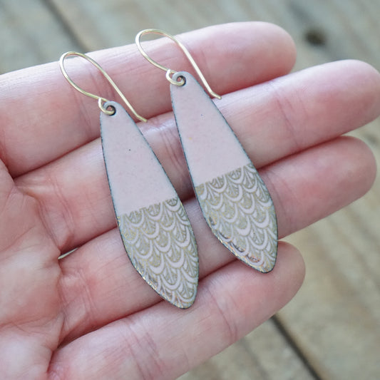 Gold Mermaid Scales on Pink Enamel Teardrop Earrings