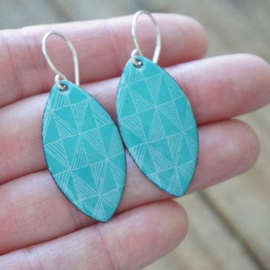 White Line Accents on Teal Green Enamel Teardrop Earrings