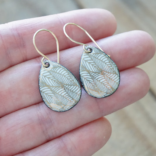 Gold Leaf Accents on White Enamel Teardrop Earrings