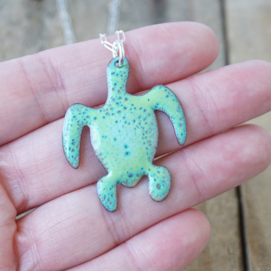 Gold Flower on Light Seafoam Green Enamel Turtle Necklace