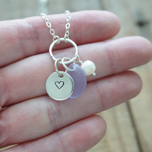 Hand Stamped Heart Charm Necklace with Sea Glass and Freshwater Pearl