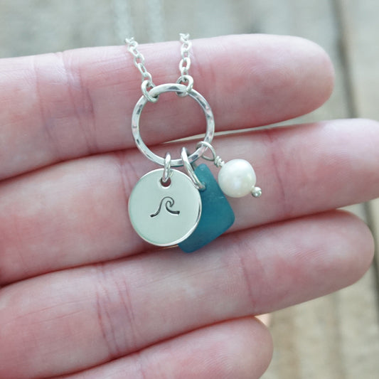 Hand Stamped Wave Charm Necklace with Sea Glass and Freshwater Pearl