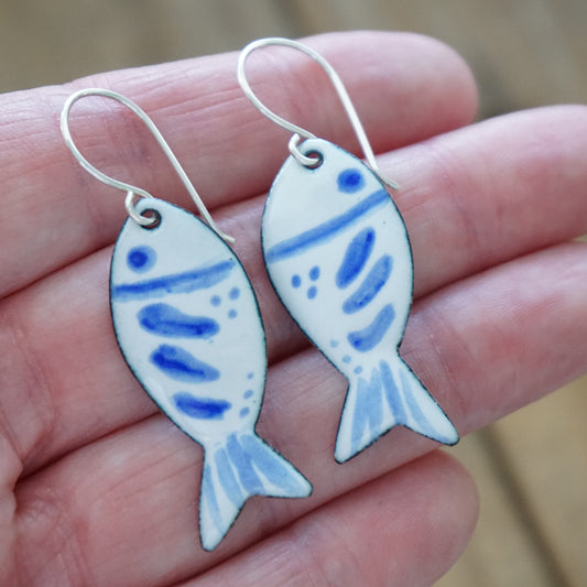 White and Blue Enamel Fish Earrings