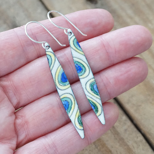 White Enamel Earrings with Blue, Green, and Yellow Swirls