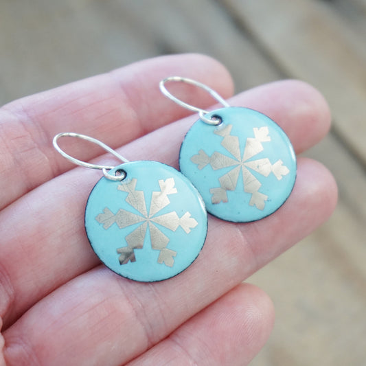 CLEARANCE Silver Snowflakes on Light Blue Enamel Disc Earrings