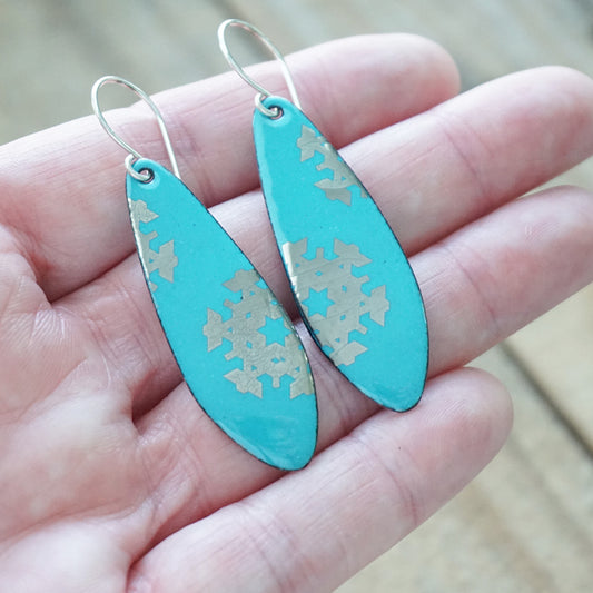 CLEARANCE Silver Snowflakes on Teal Green Enamel Teardrop Earrings