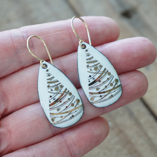 CLEARANCEGold Christmas Trees on White Enamel Teardrop Earrings