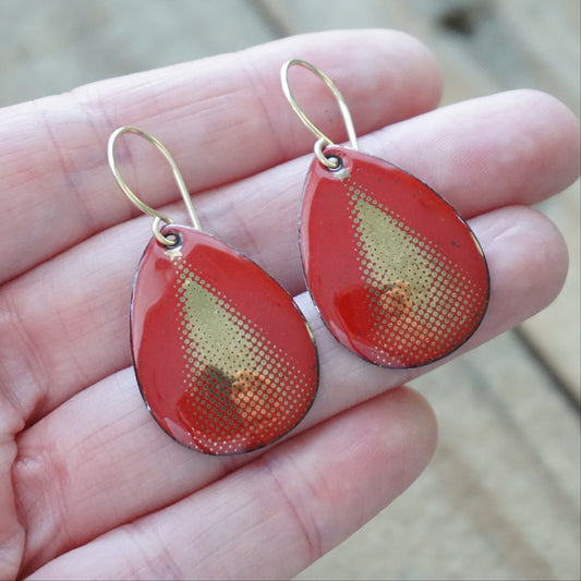 CLEARANCE Gold Christmas Trees on Red Enamel Teardrop Earrings