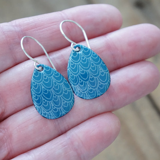 Peacock Teal Enamel Teardrop Earrings with White Mermaid Accents