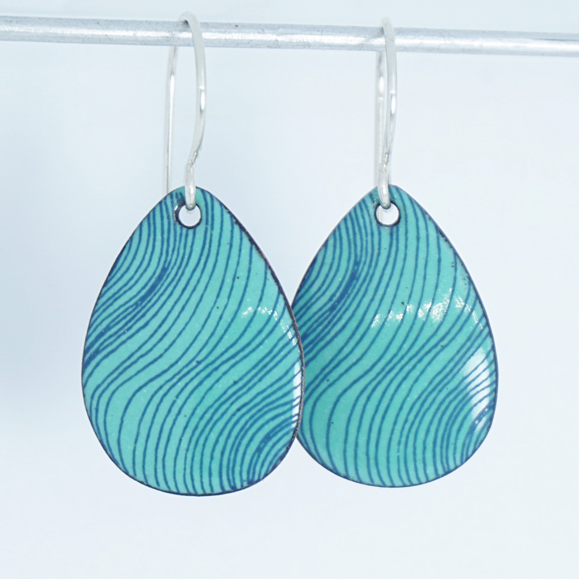 To create these earrings, I hand cut and dome the copper blanks. I then fire lead free vitreous enamel in a kiln to over 1500°. The design is achieved using kiln fired enamel decals. Multiple layers, techniques, and firings are necessary to achieve the look of these earrings.