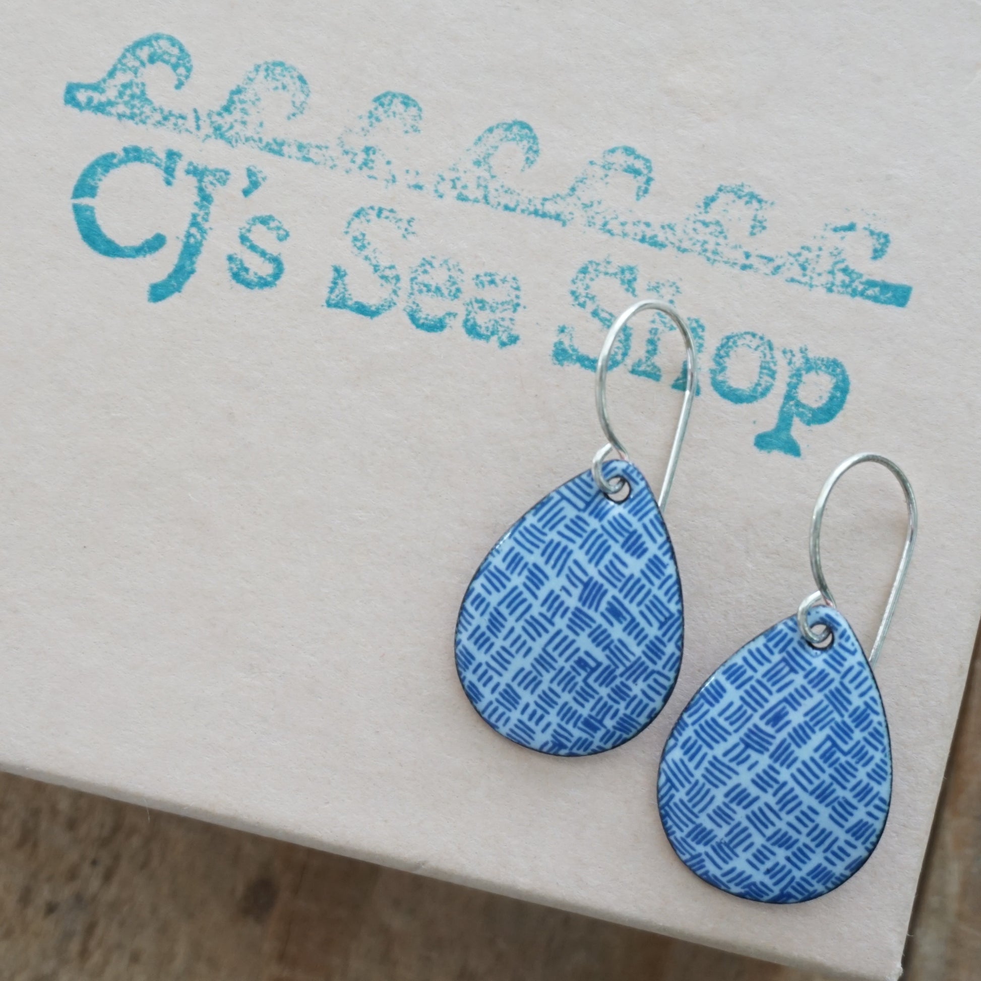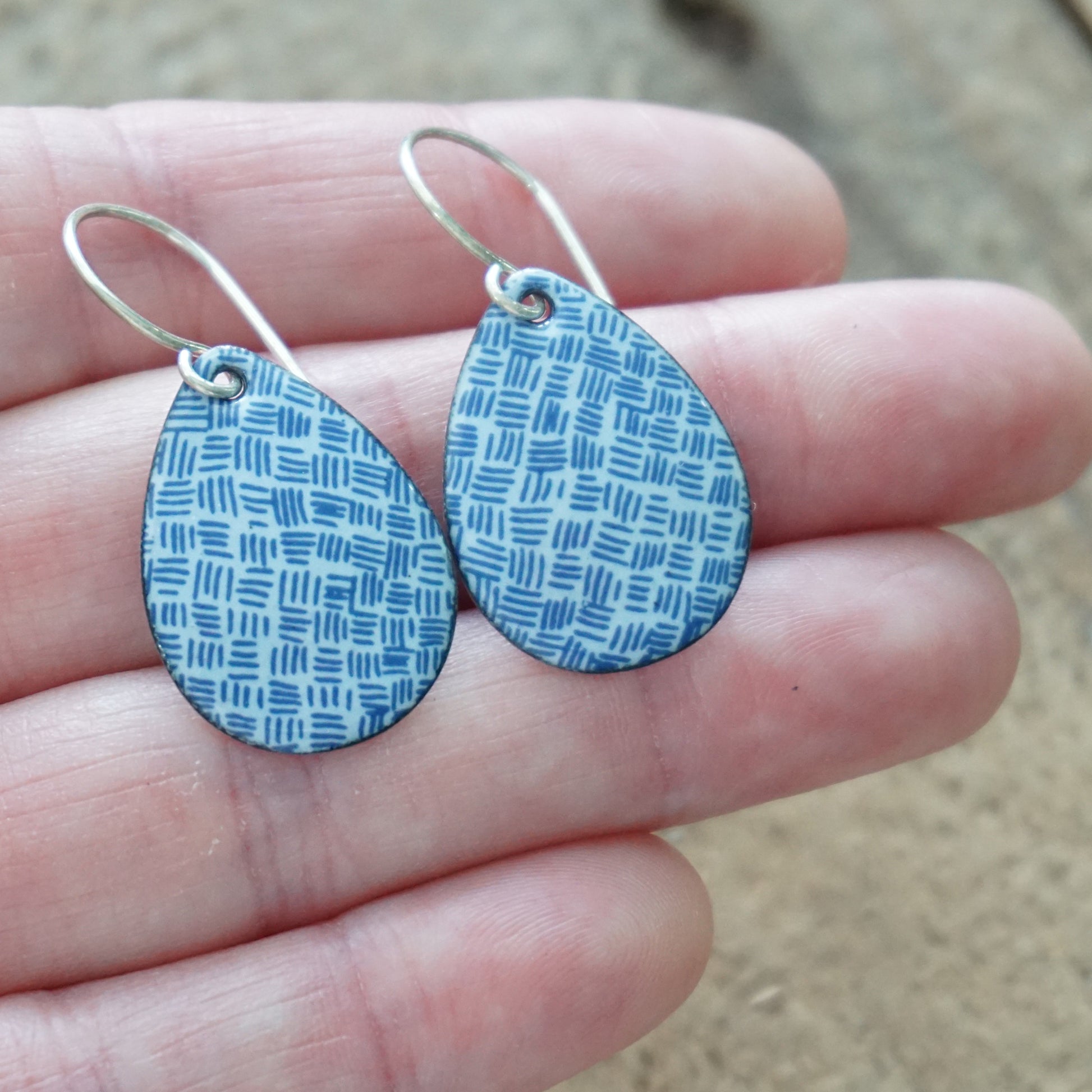 To create these earrings, I hand cut and dome the copper blanks. I then fire lead free vitreous enamel in a kiln to over 1500°. The design is achieved using kiln fired enamel decals. Multiple layers, techniques, and firings are necessary to achieve the look of these earrings.