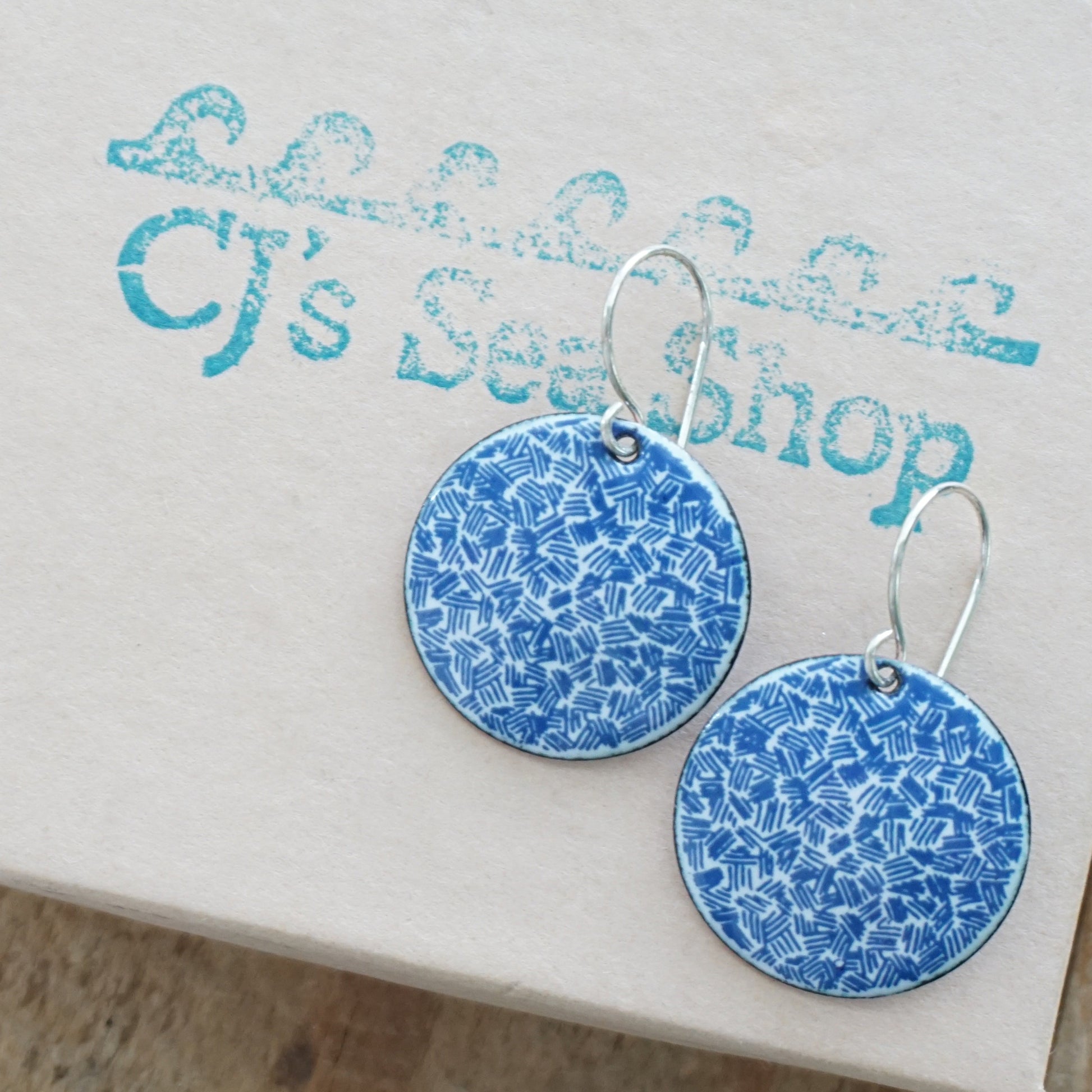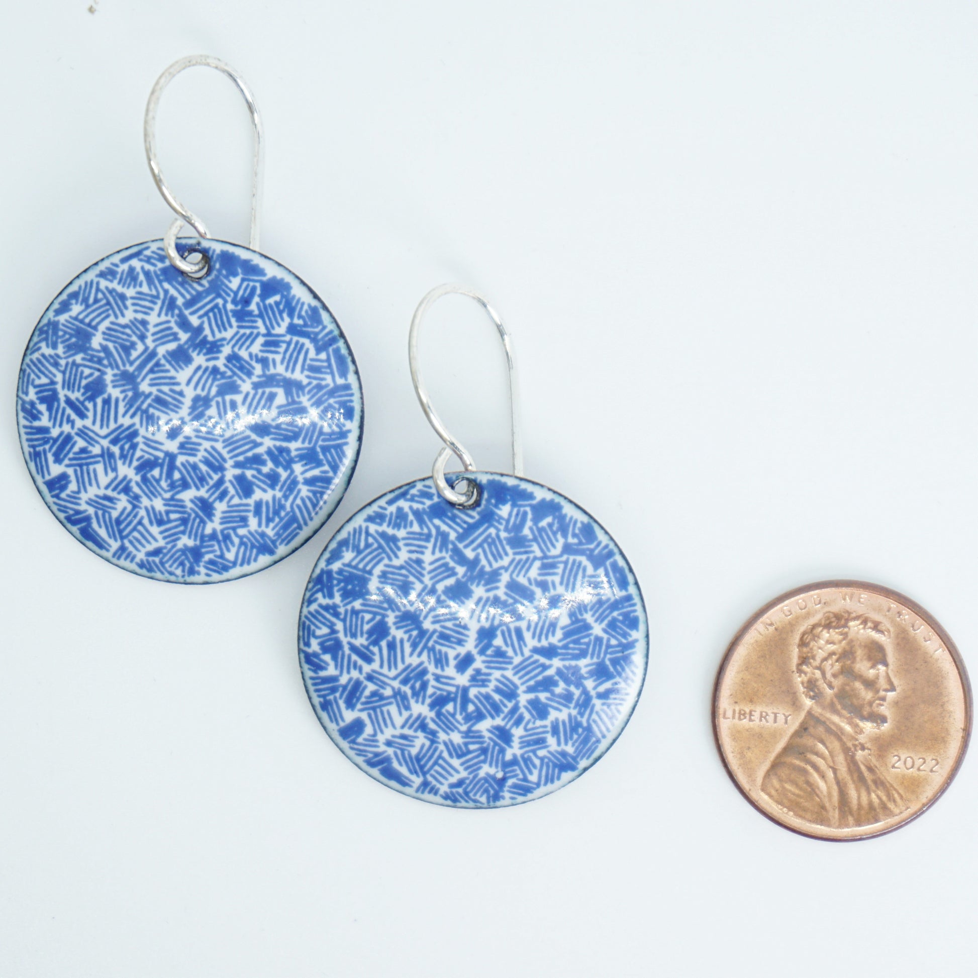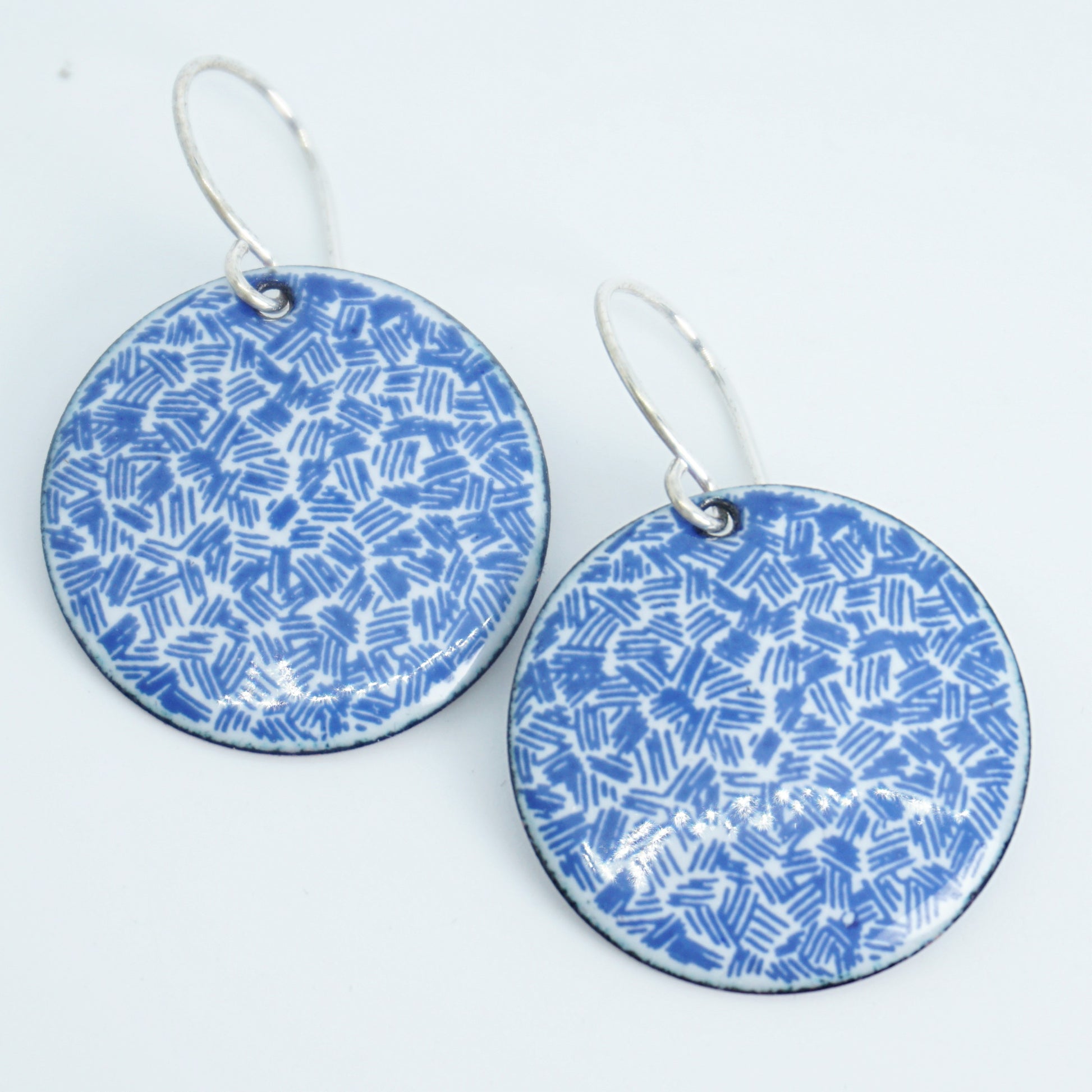 To create these earrings, I hand cut and dome the copper blanks. I then fire lead free vitreous enamel in a kiln to over 1500°. The design is achieved using kiln fired enamel decals. Multiple layers, techniques, and firings are necessary to achieve the look of these earrings.