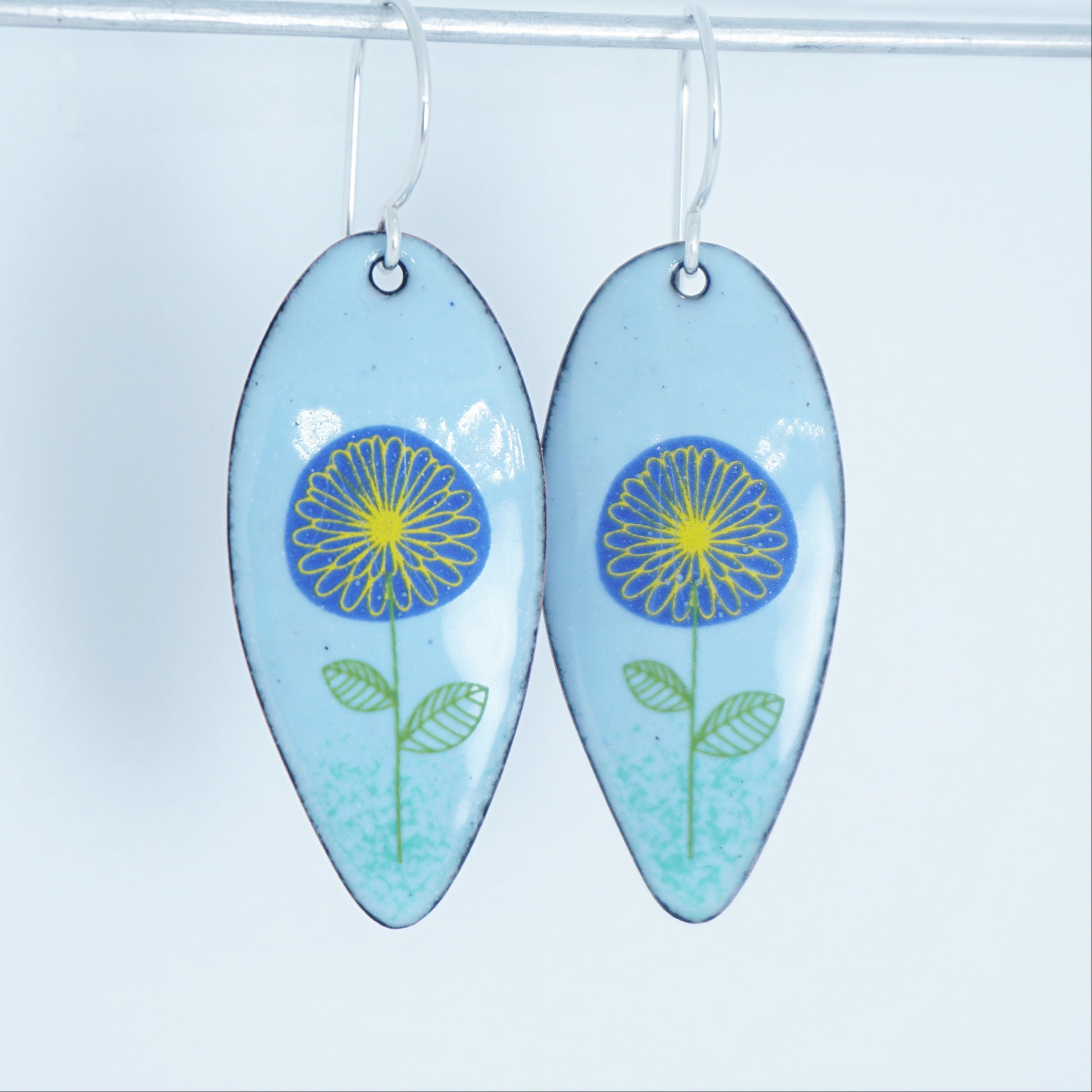 CLEARANCE Blue and Yellow Daisies on Light Blue Enamel Teardrop Earrings