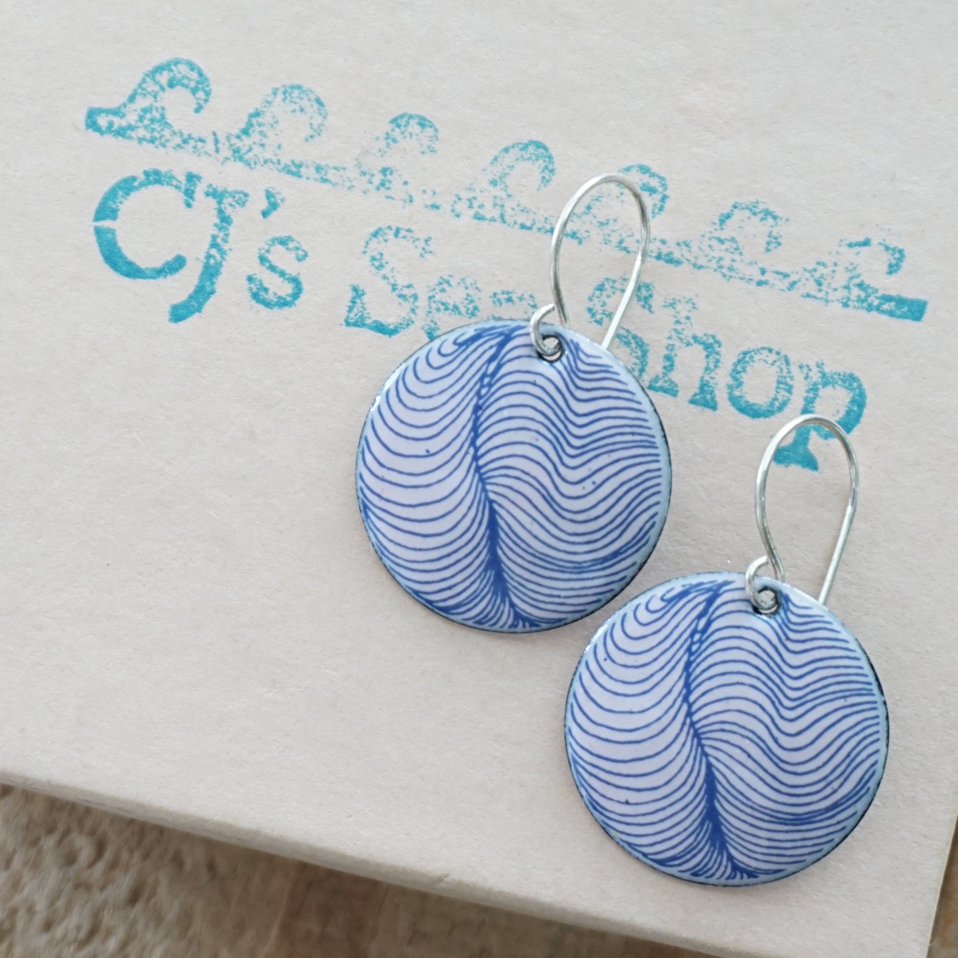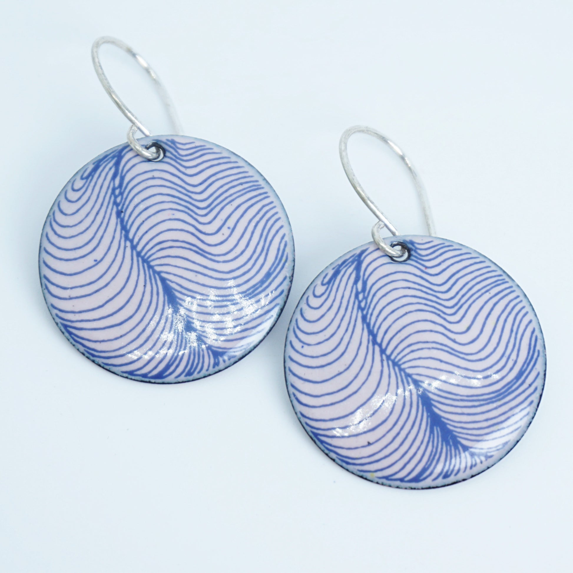 To create these earrings, I hand cut and dome the copper blanks. I then fire lead free vitreous enamel in a kiln to over 1500°. The design is achieved using kiln fired enamel decals. Multiple layers, techniques, and firings are necessary to achieve the look of these earrings.