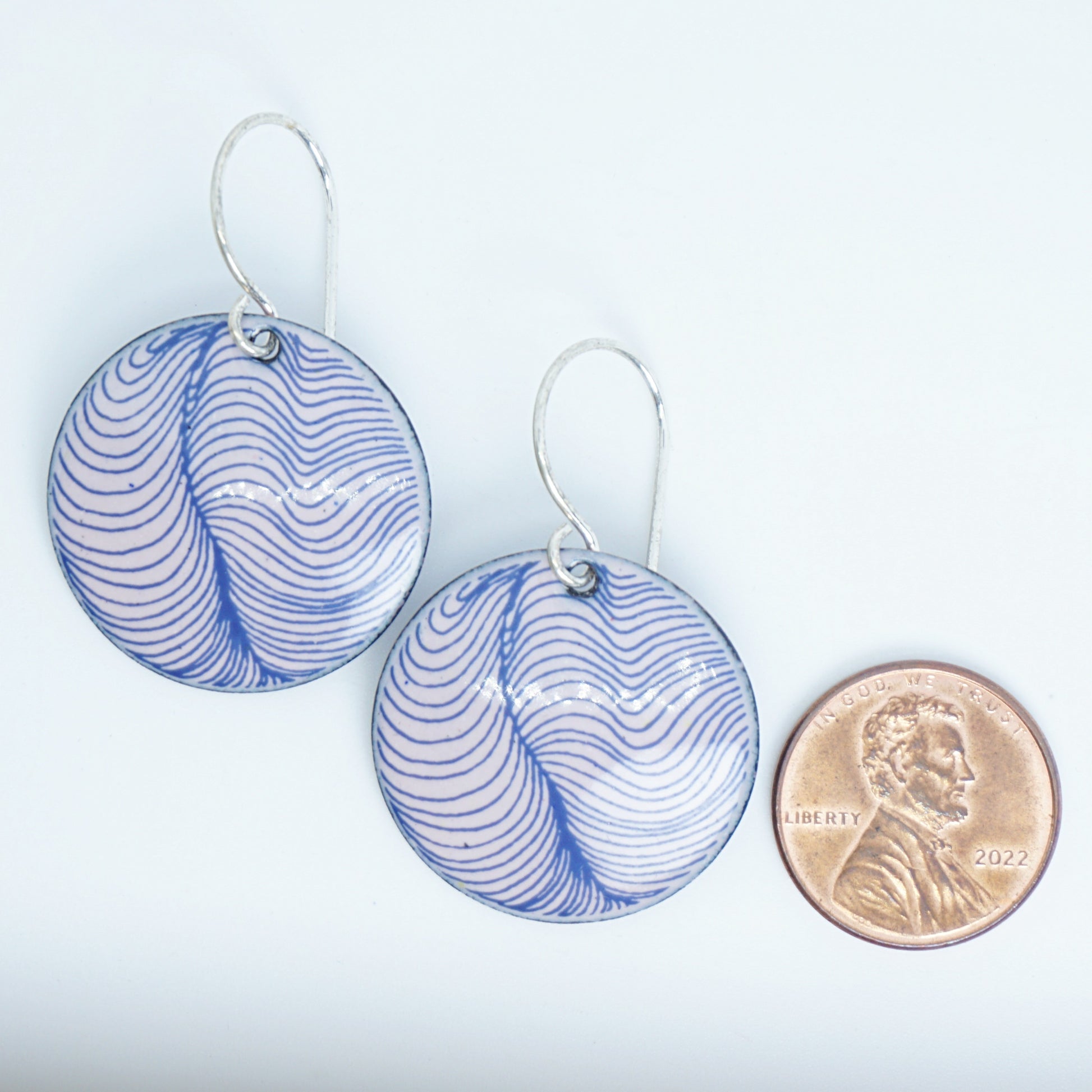 Blue Feather Accents on Pink Enamel Disc Earrings