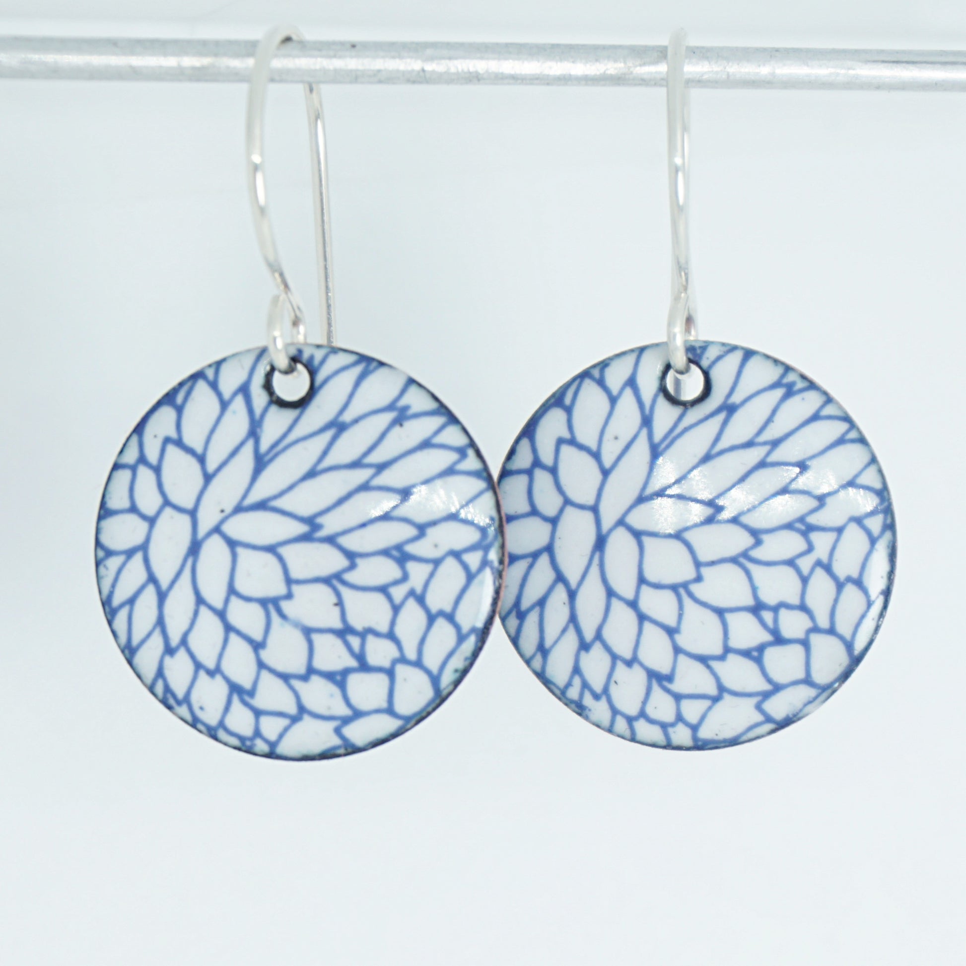 To create these earrings, I hand cut and dome the copper blanks. I then fire lead free vitreous enamel in a kiln to over 1500°. The design is achieved using kiln fired enamel decals. Multiple layers, techniques, and firings are necessary to achieve the look of these earrings.