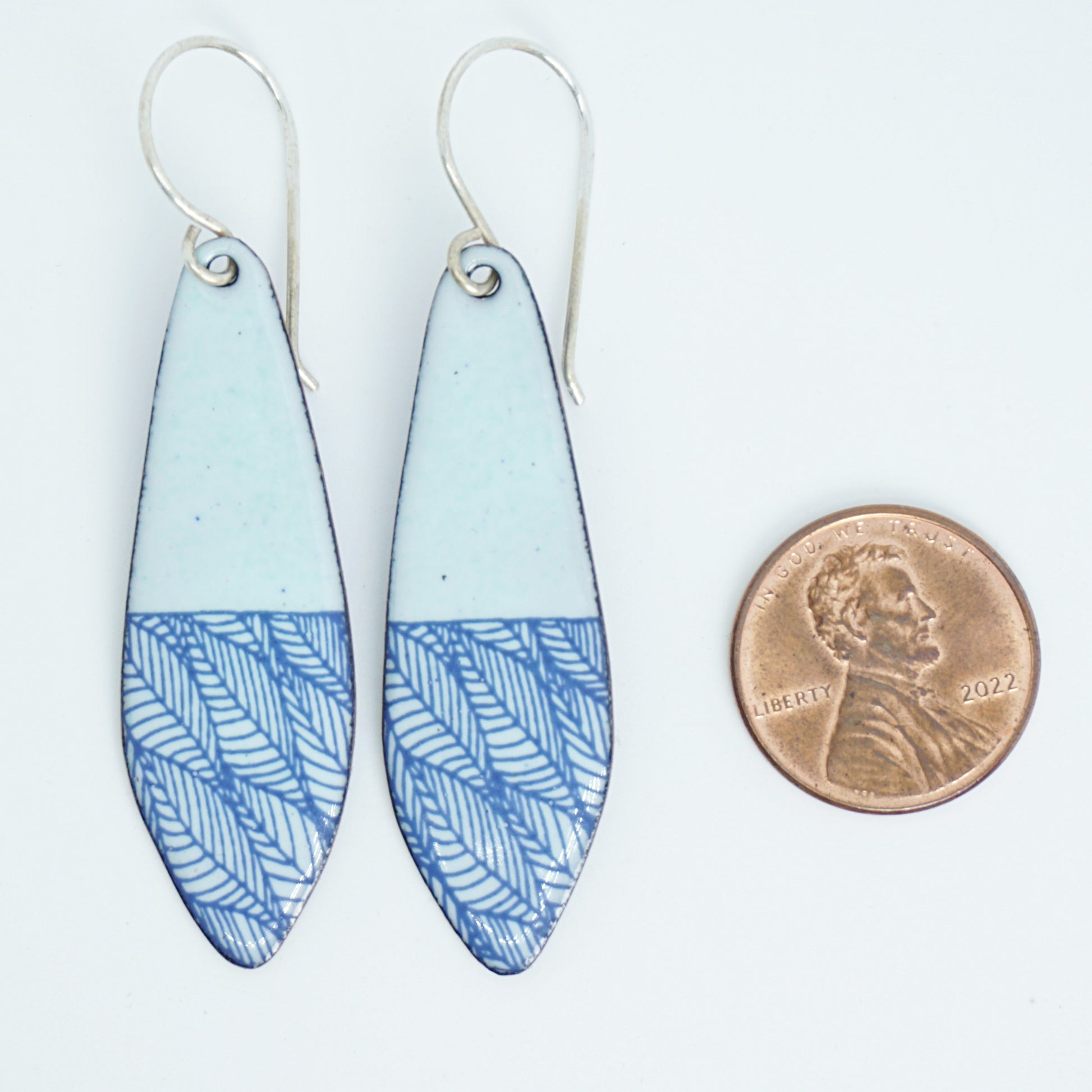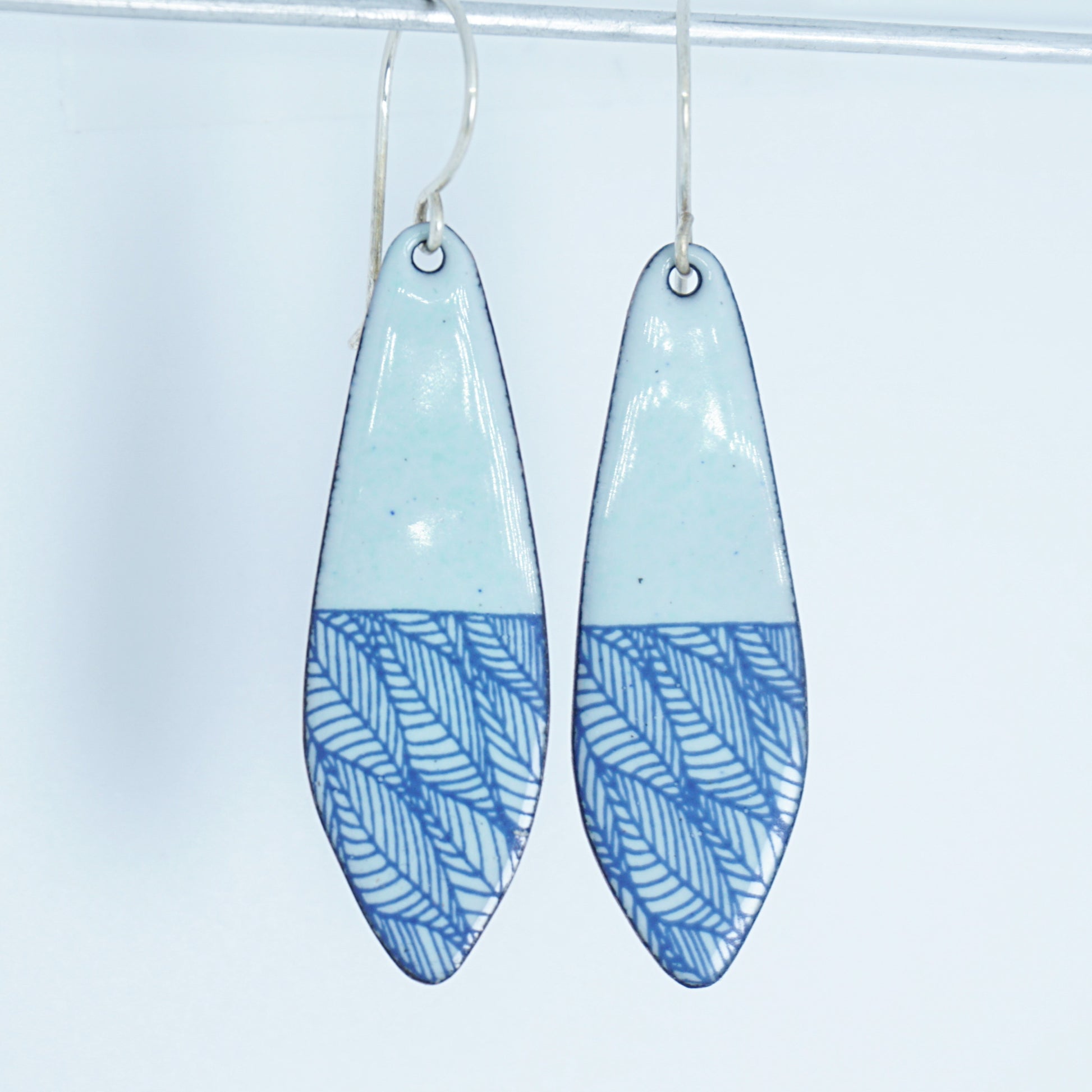Blue leaf accents on seafoam green enamel teardrop earrings.