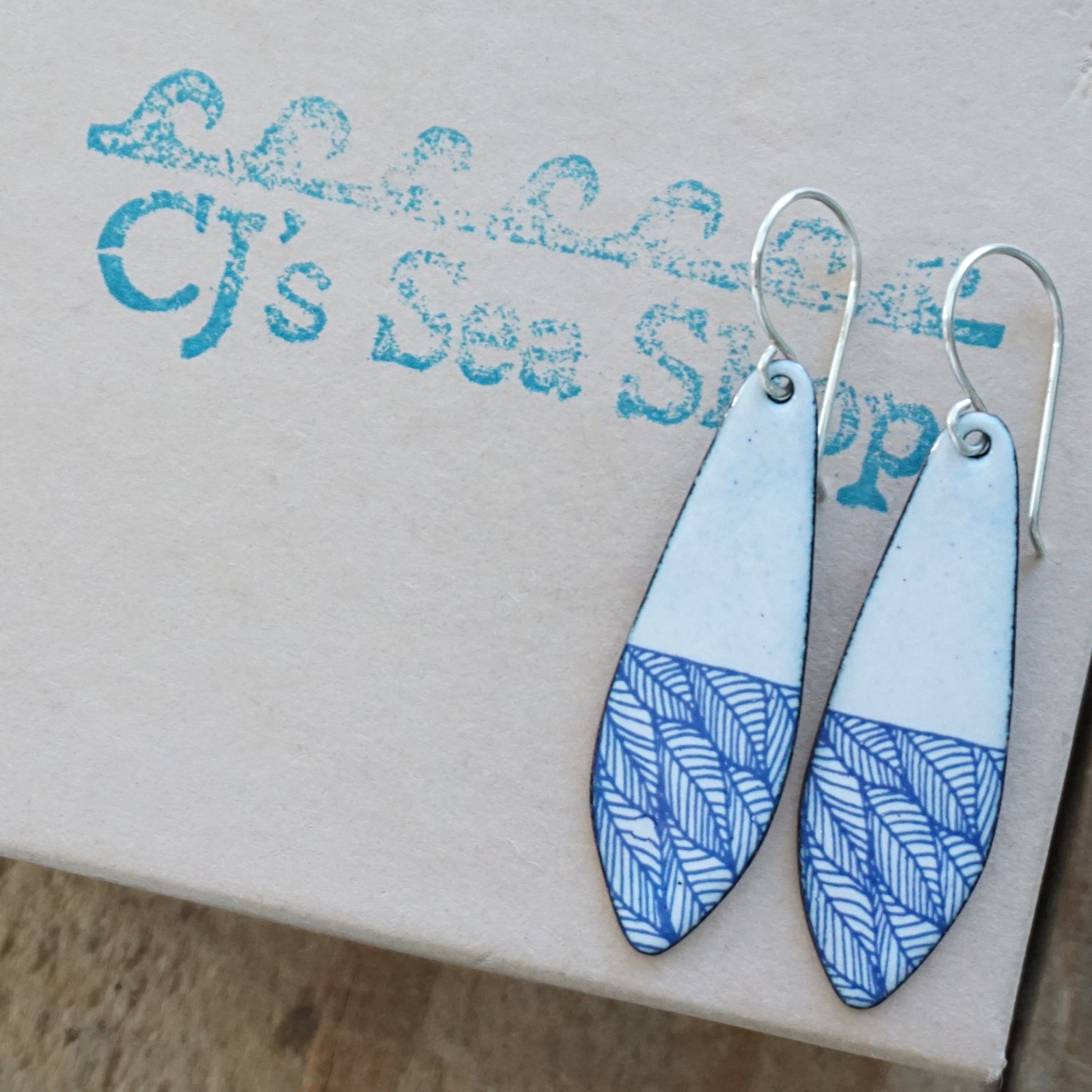 Blue leaf accents on white enamel teardrop earrings. There is a light sprinkle of light periwinkle on the white enamel.