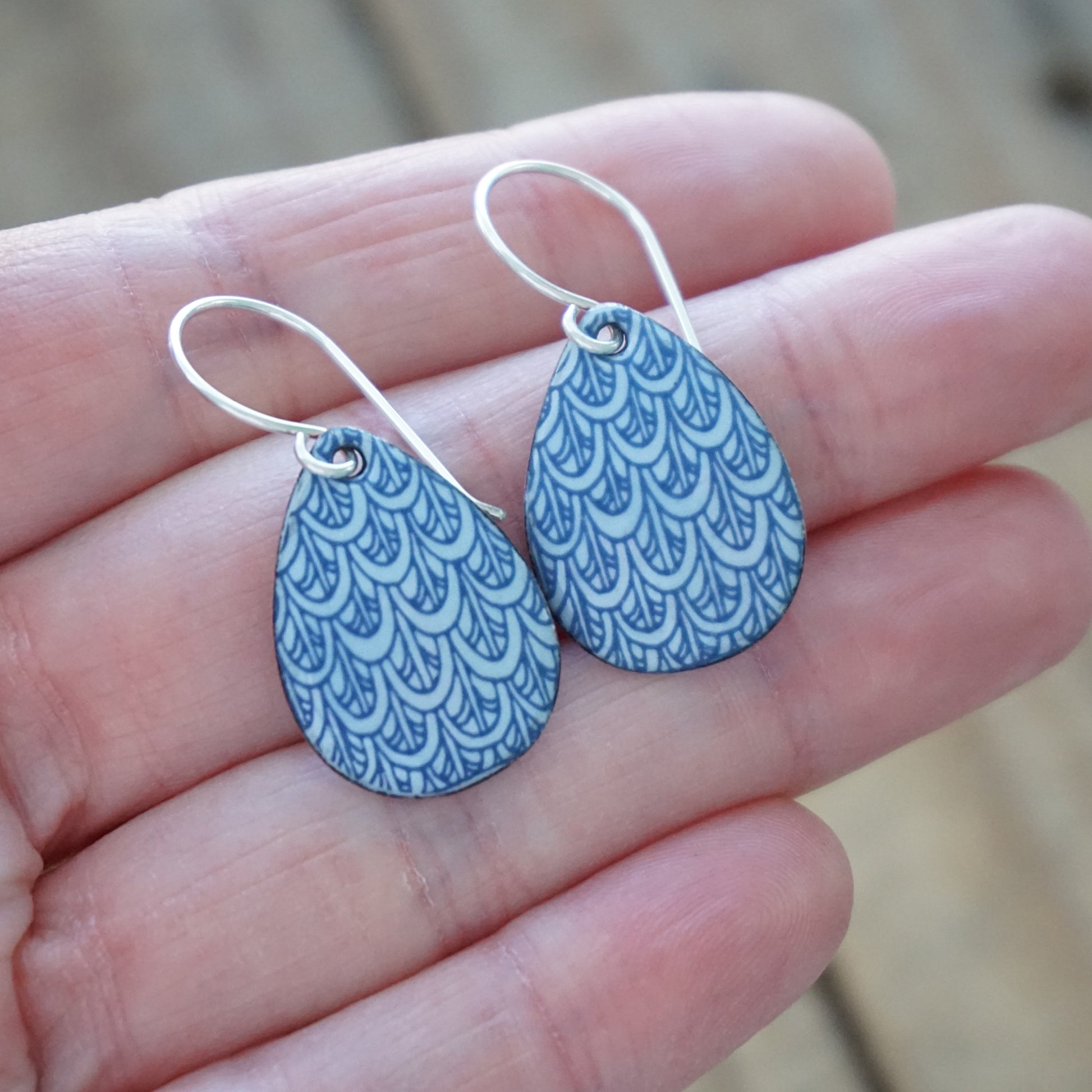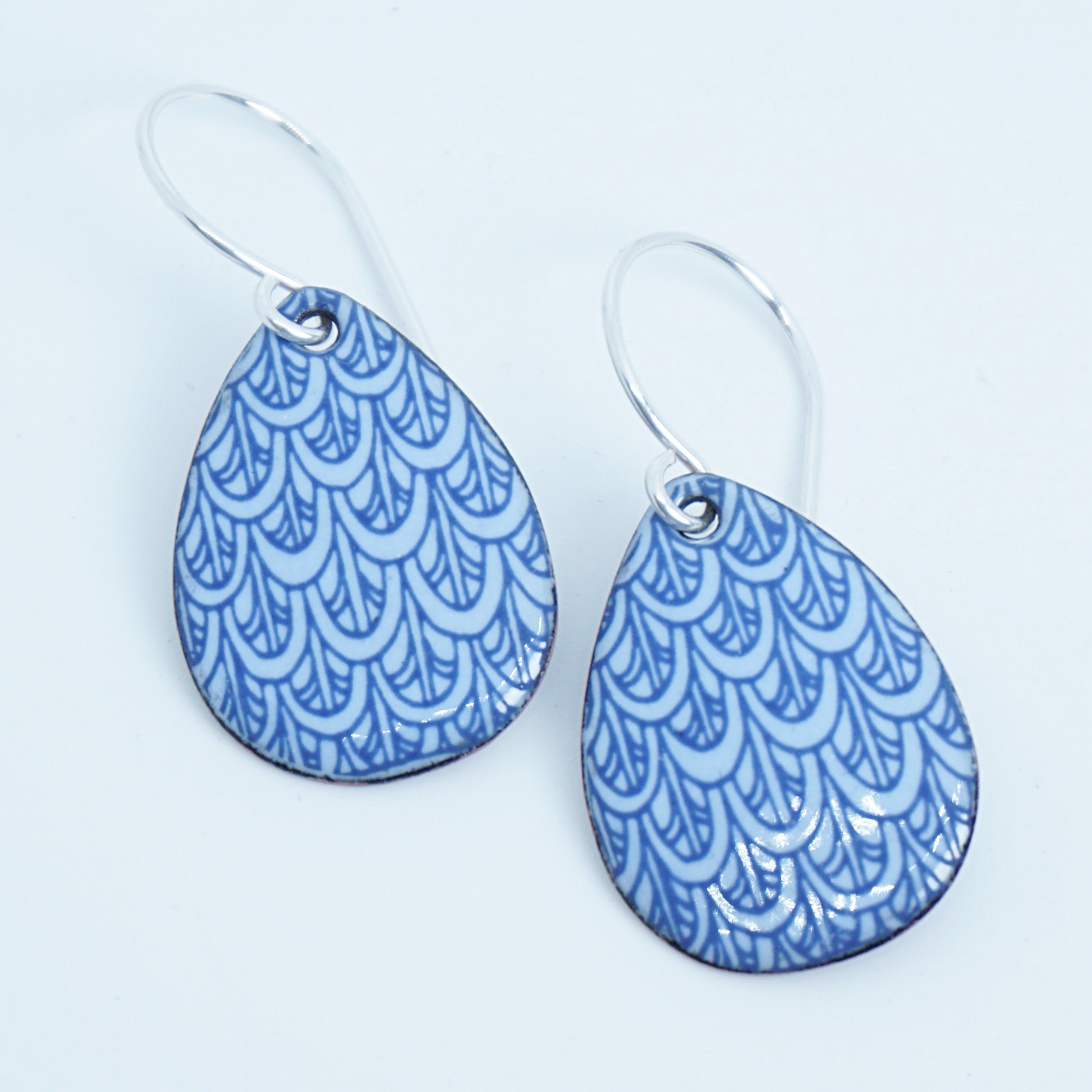 Blue mermaid scale accents on light periwinkle enamel teardrop earrings.
