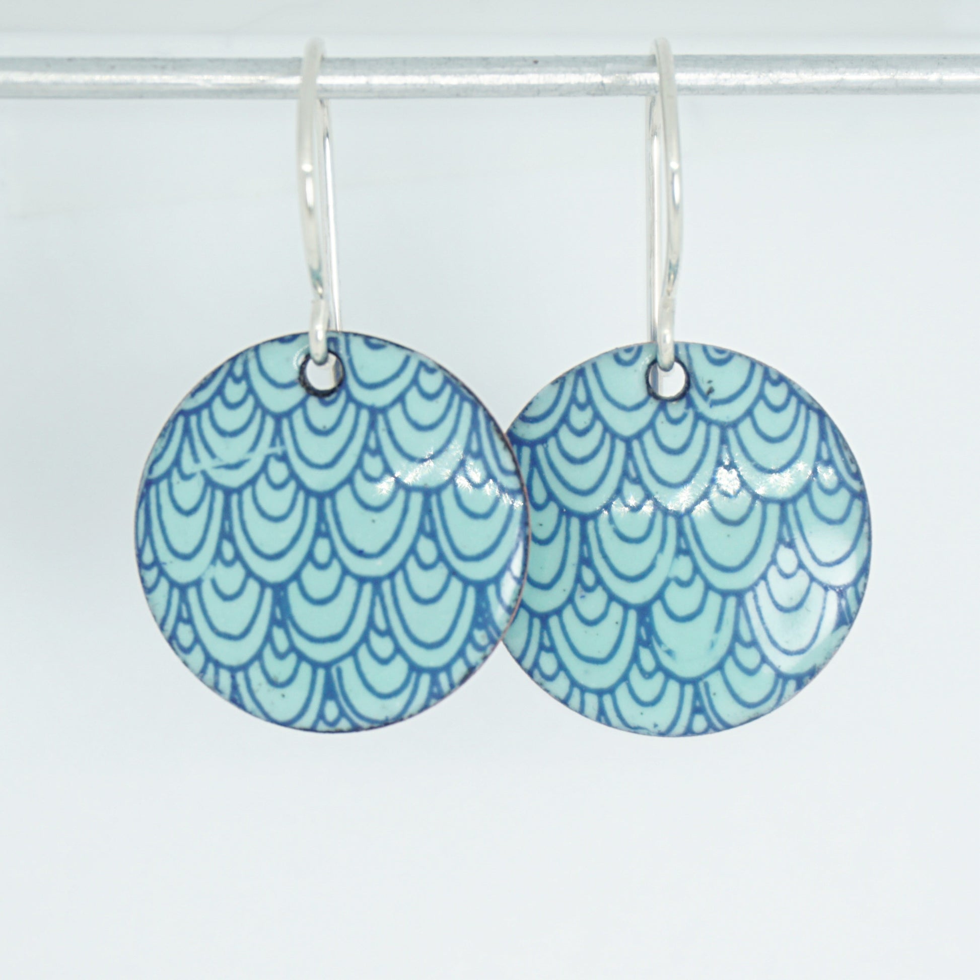 Blue mermaid scale accents on seafoam green enamel disc earrings.