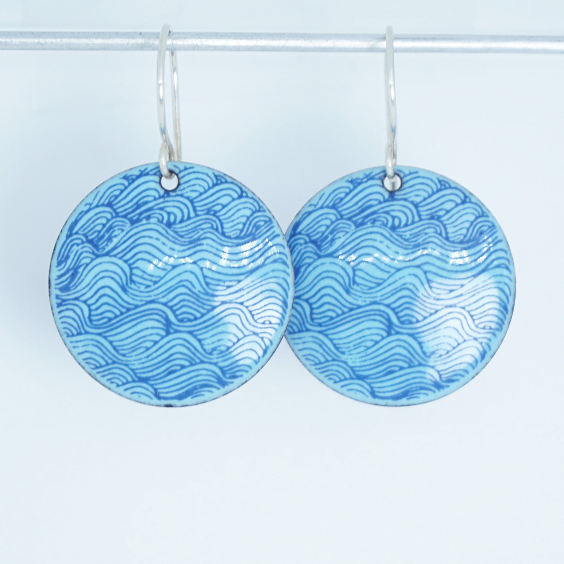 To create these earrings, I hand cut and dome the copper blanks. I then fire lead free vitreous enamel in a kiln to over 1500°. The design is achieved using kiln fired enamel decals. Multiple layers, techniques, and firings are necessary to achieve the look of these earrings.