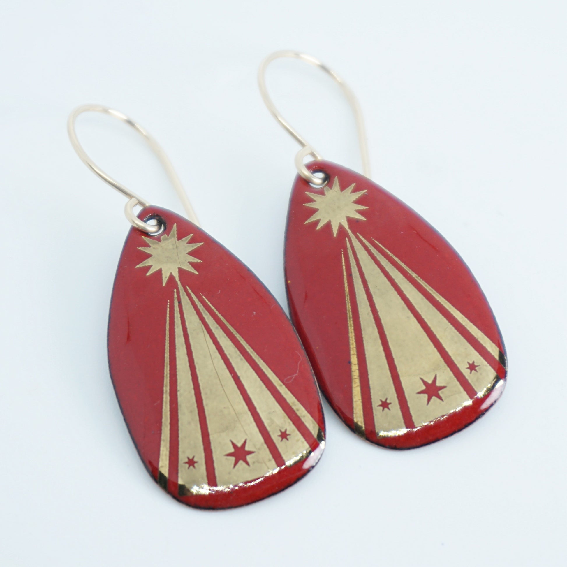 Gold Christmas Trees on Red Enamel Teardrop Earrings