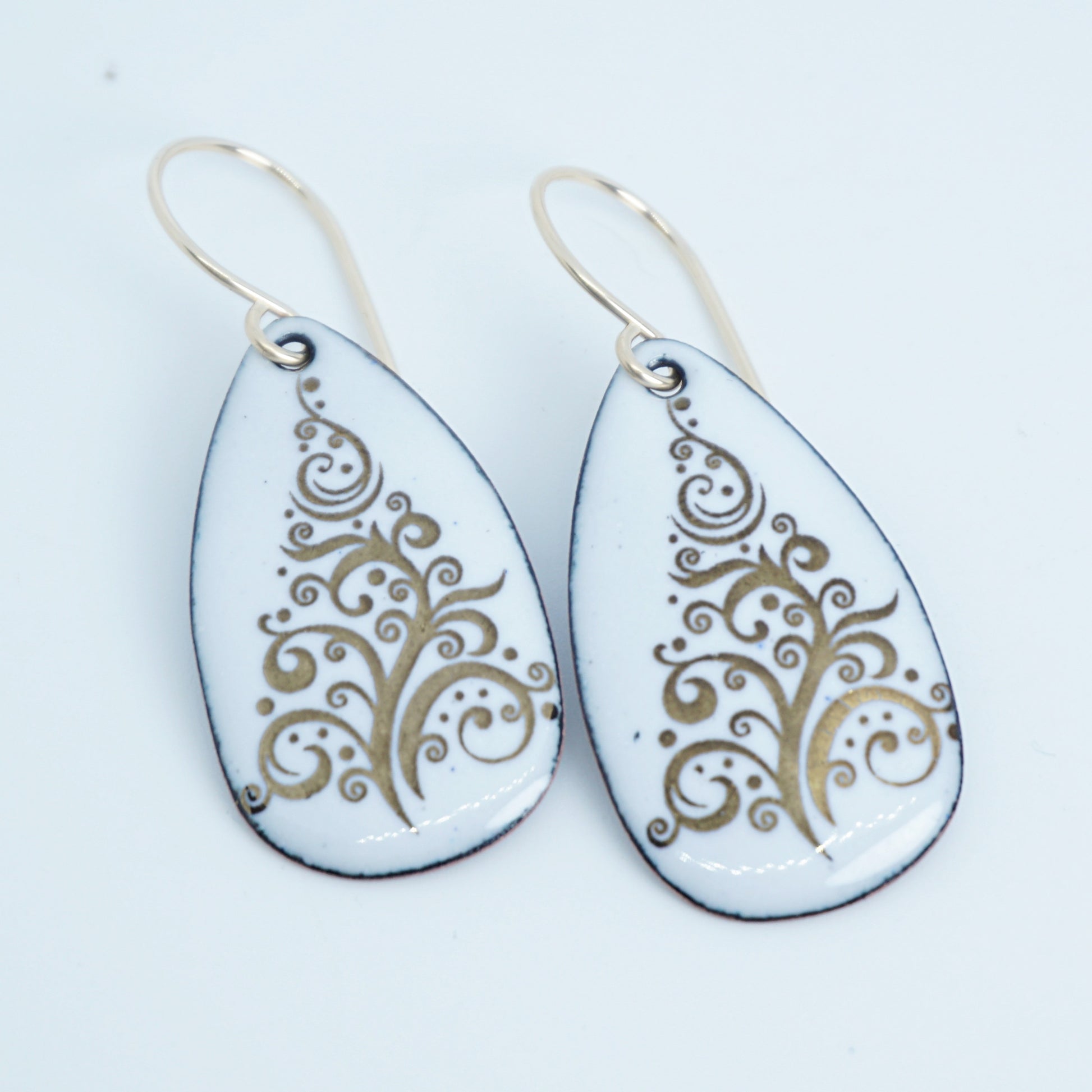 Gold Christmas Trees on White Enamel Teardrop Earrings