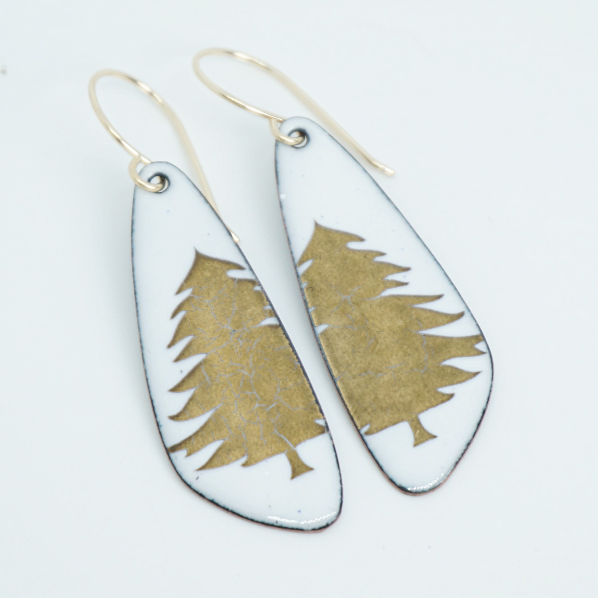 Gold Christmas trees on white enamel teardrop earrings.