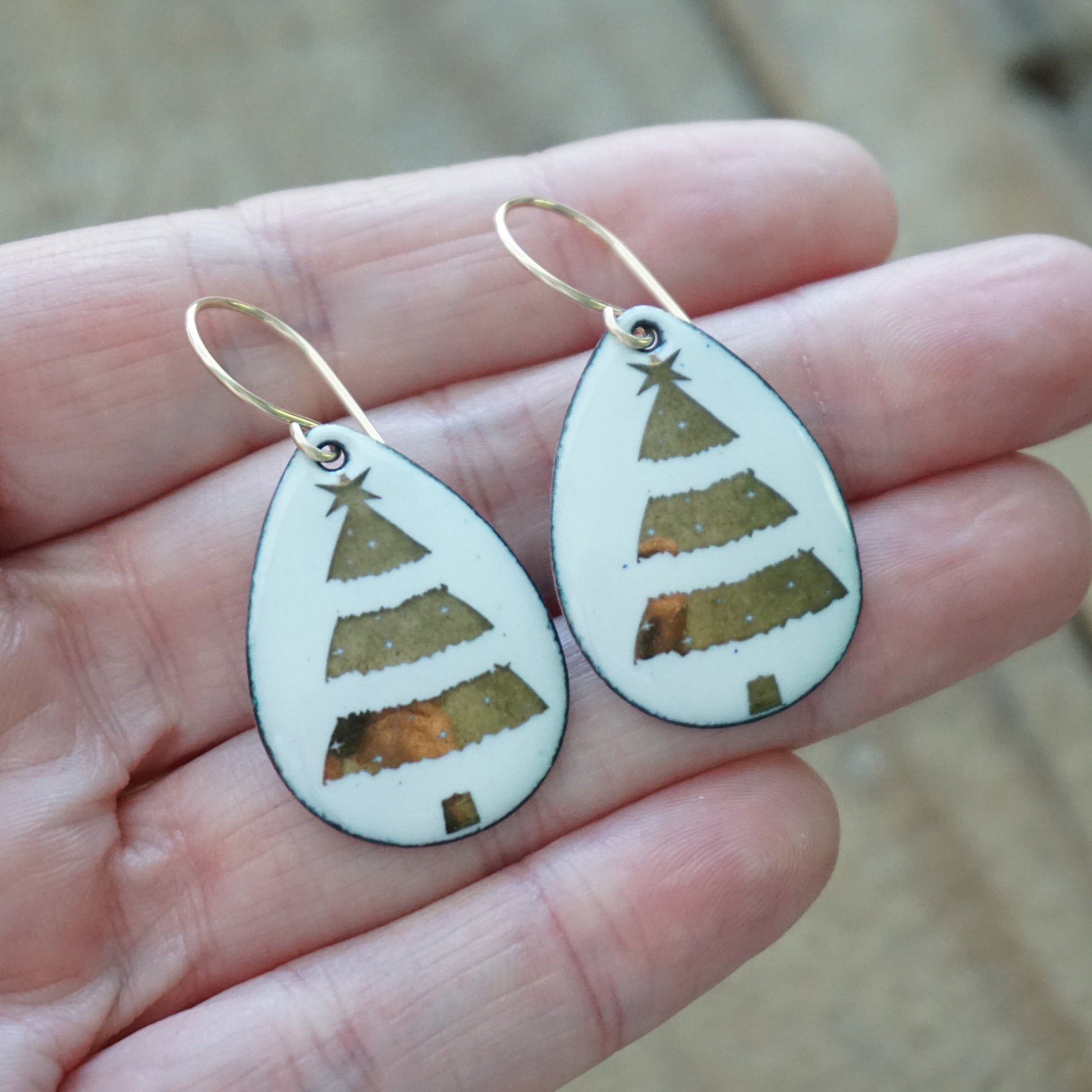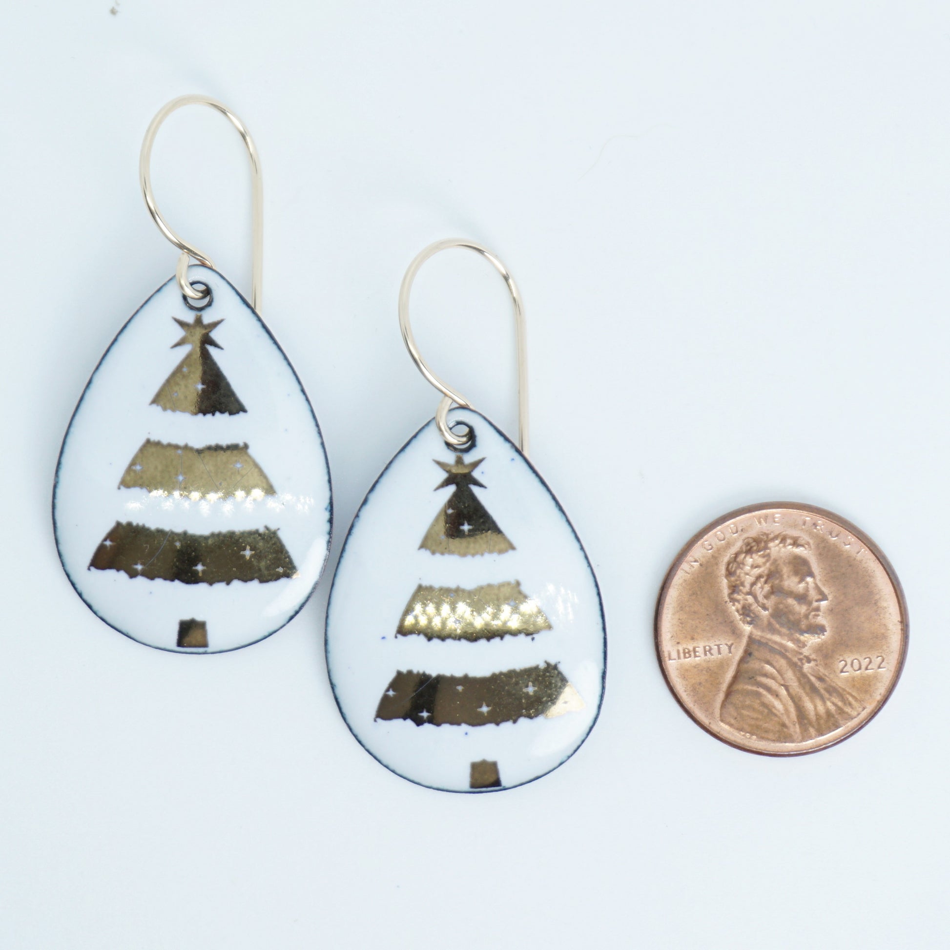 Gold Christmas Trees on White Enamel Teardrop Earrings