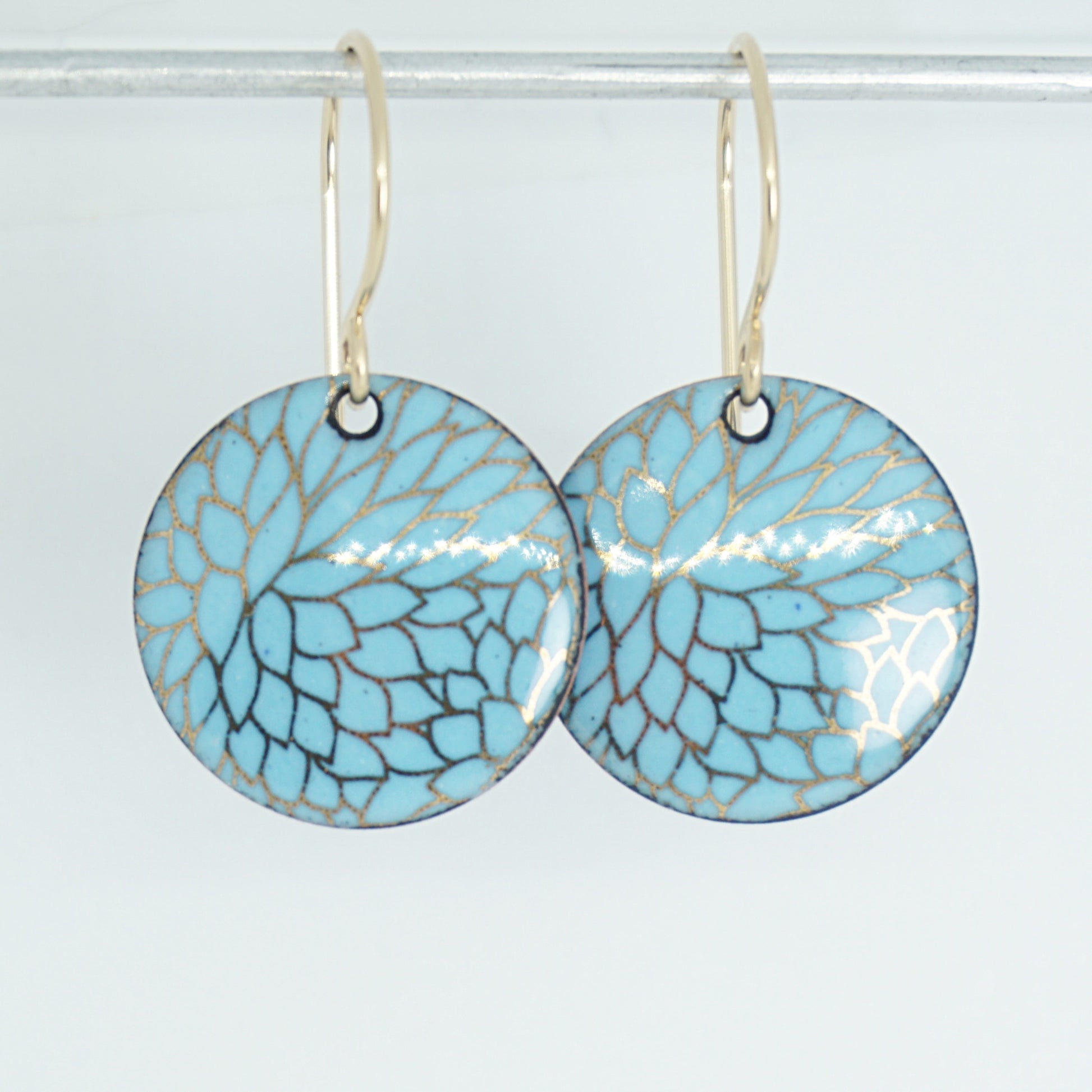Gold Flower Accents on Light Blue Enamel Disc Earrings