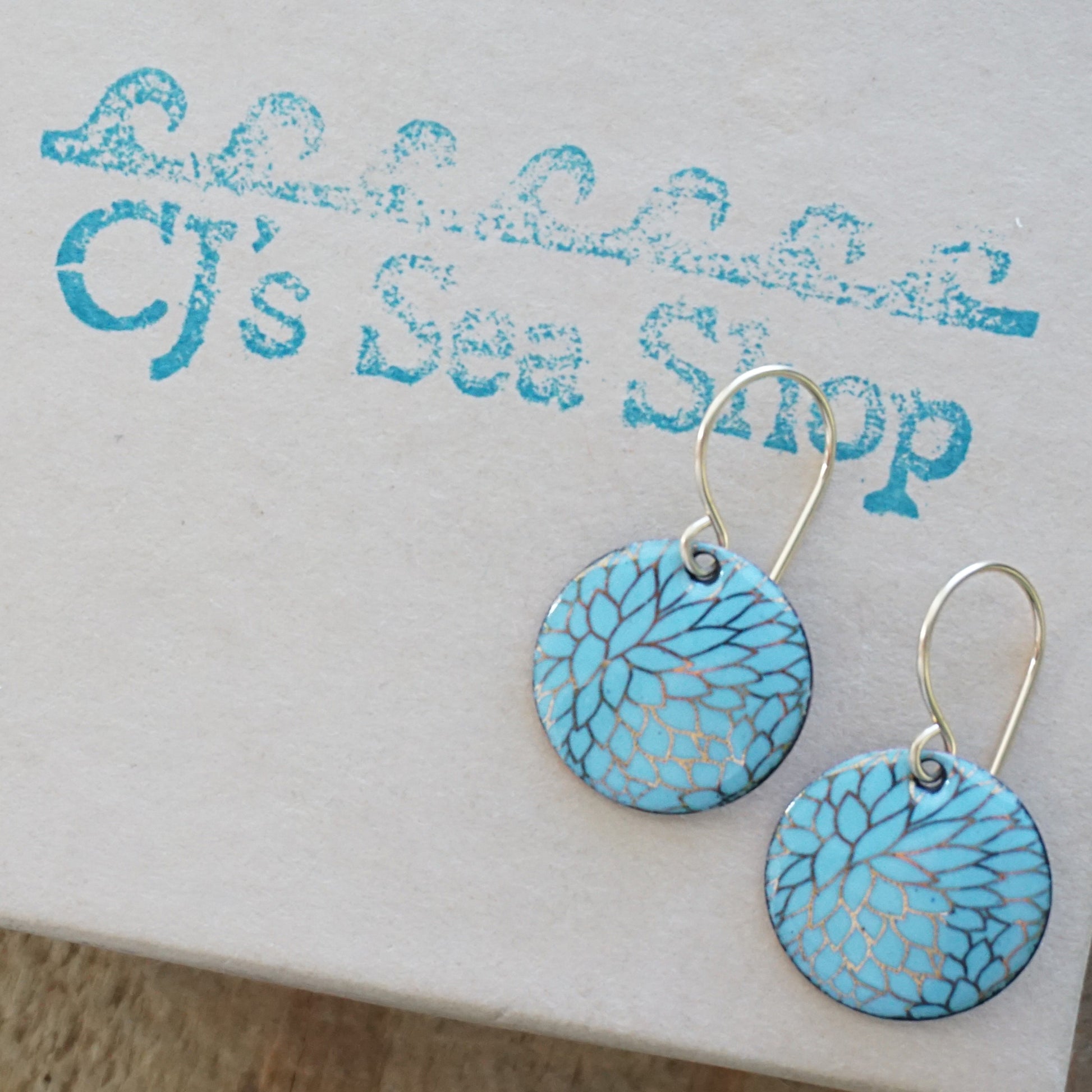 To create these earrings, I hand cut and dome the copper blanks. I then fire lead free vitreous enamel in a kiln to over 1500°. The design is achieved using kiln fired enamel decals. Multiple layers, techniques, and firings are necessary to achieve the look of these earrings.