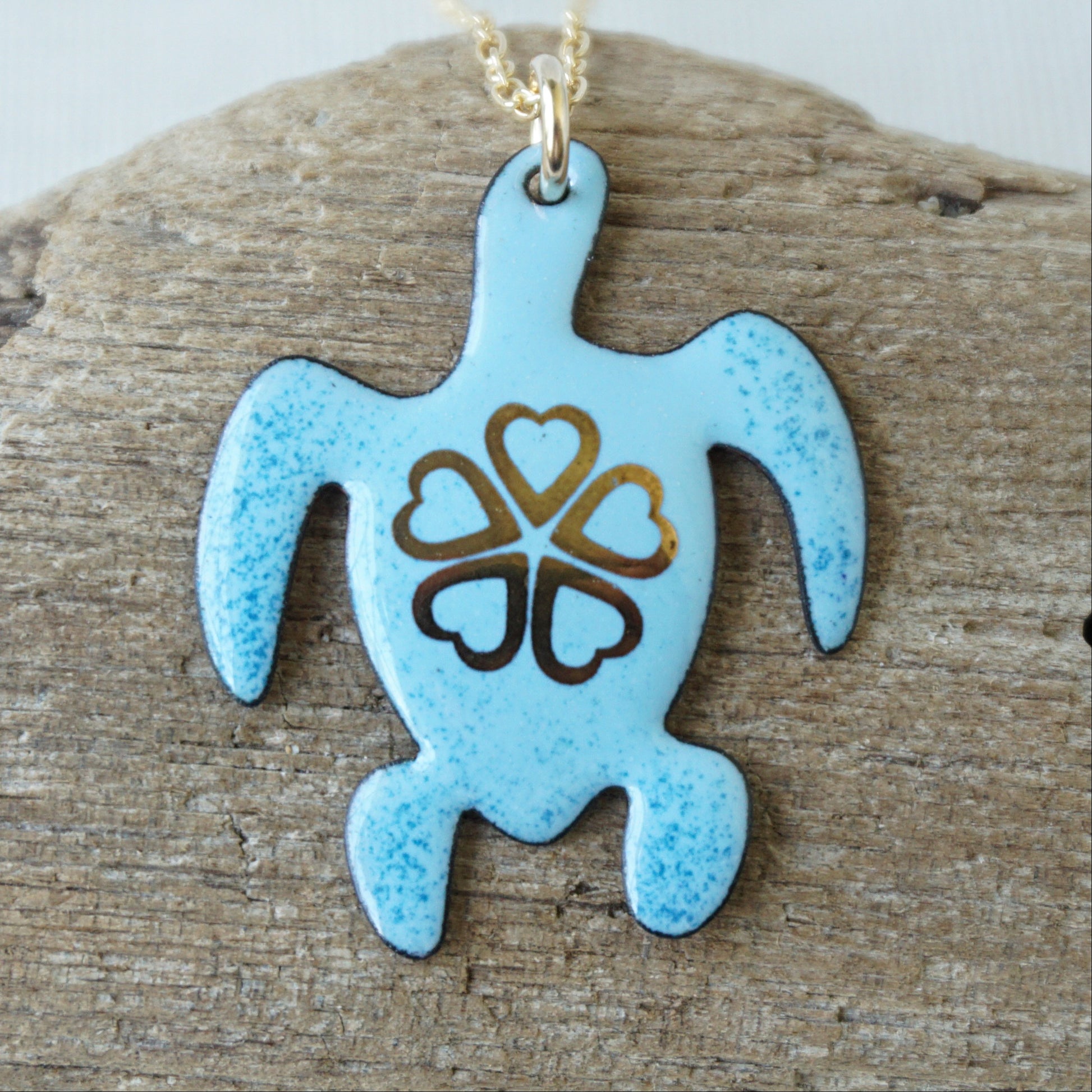 Gold flower on light blue enamel turtle pendant.