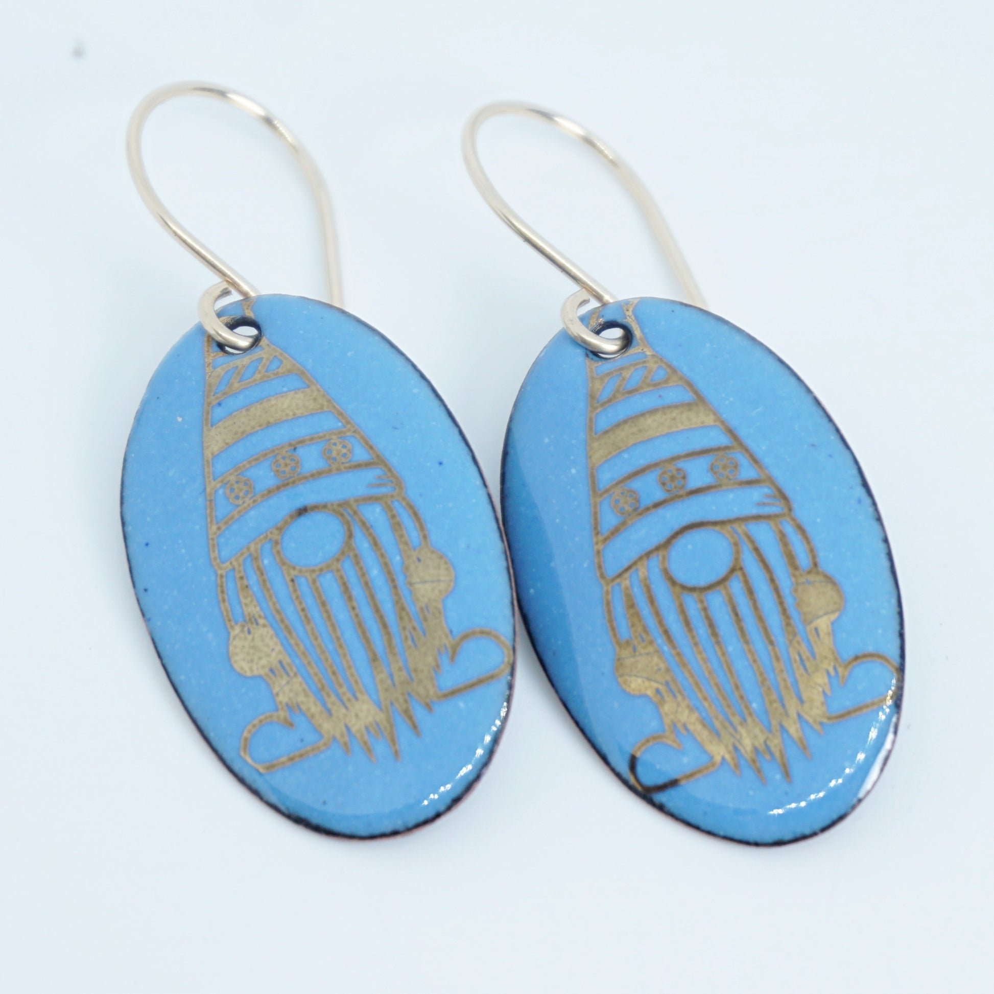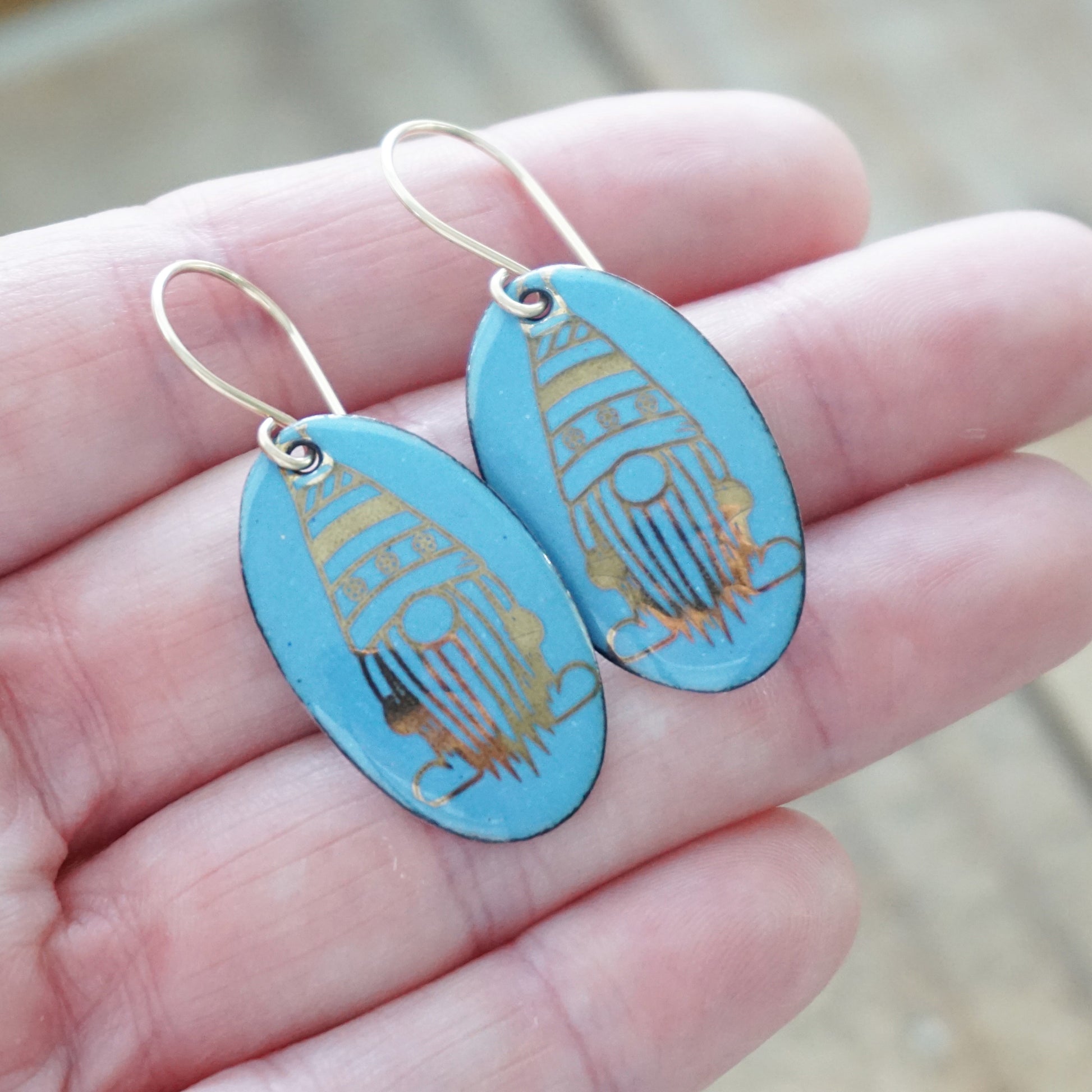 To create these earrings, I hand cut and dome the copper blanks. I then fire lead free vitreous enamel in a kiln to over 1500°. The design is achieved using kiln fired enamel decals. Multiple layers, techniques, and firings are necessary to achieve the look of these earrings.