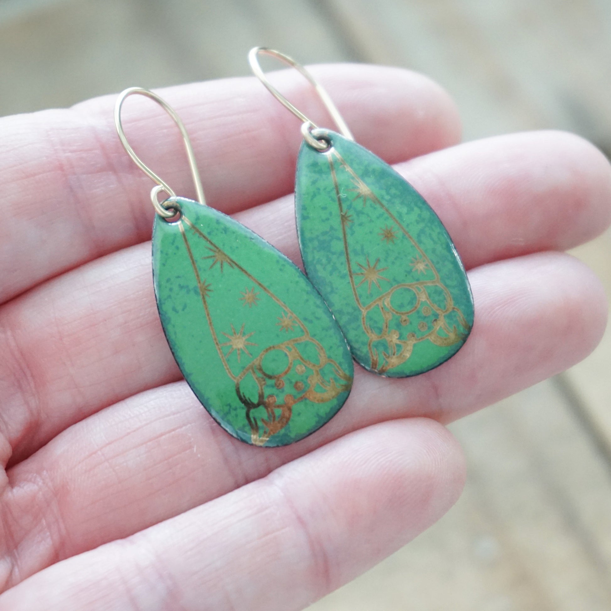 Gold Gnomes on Green Enamel Teardrop Earrings