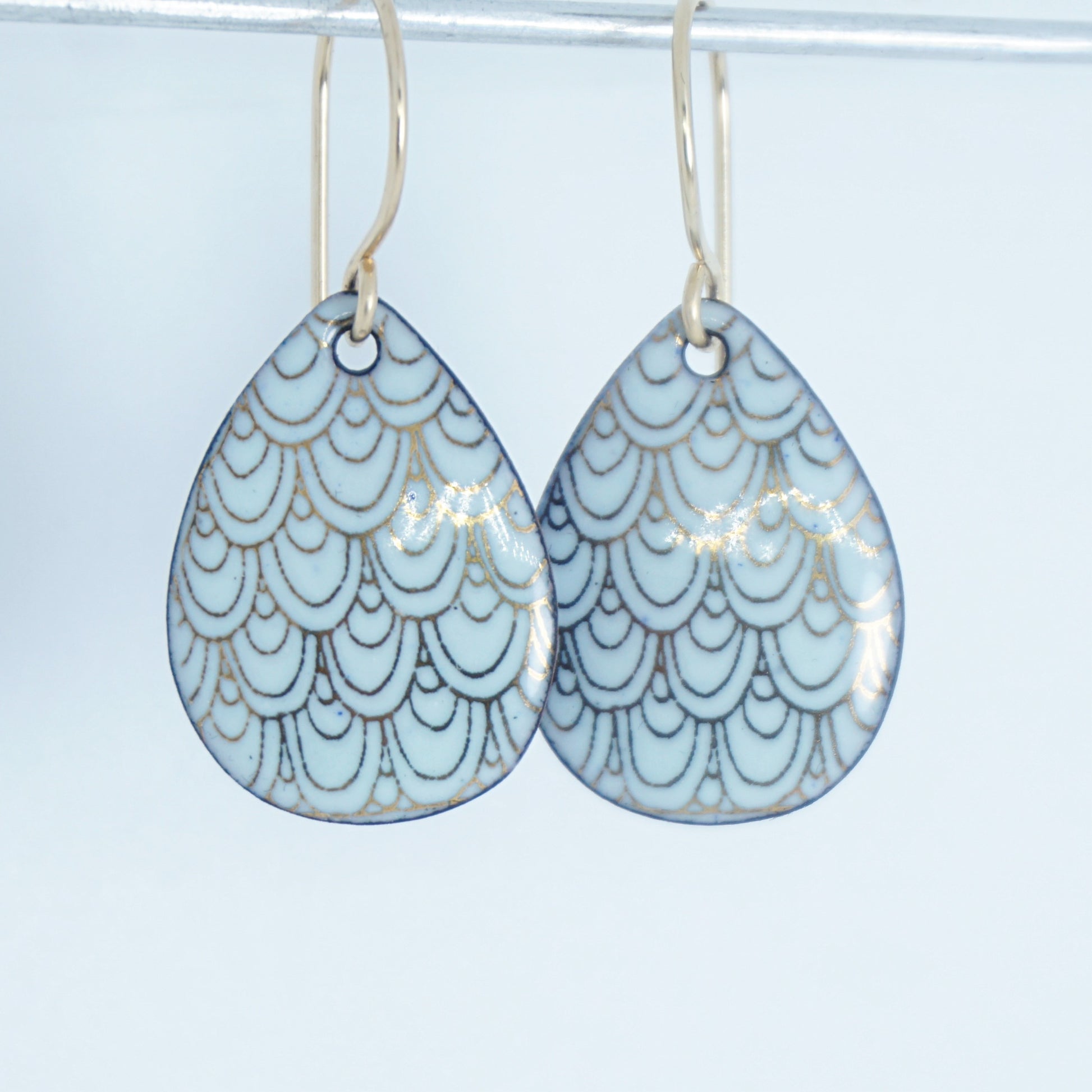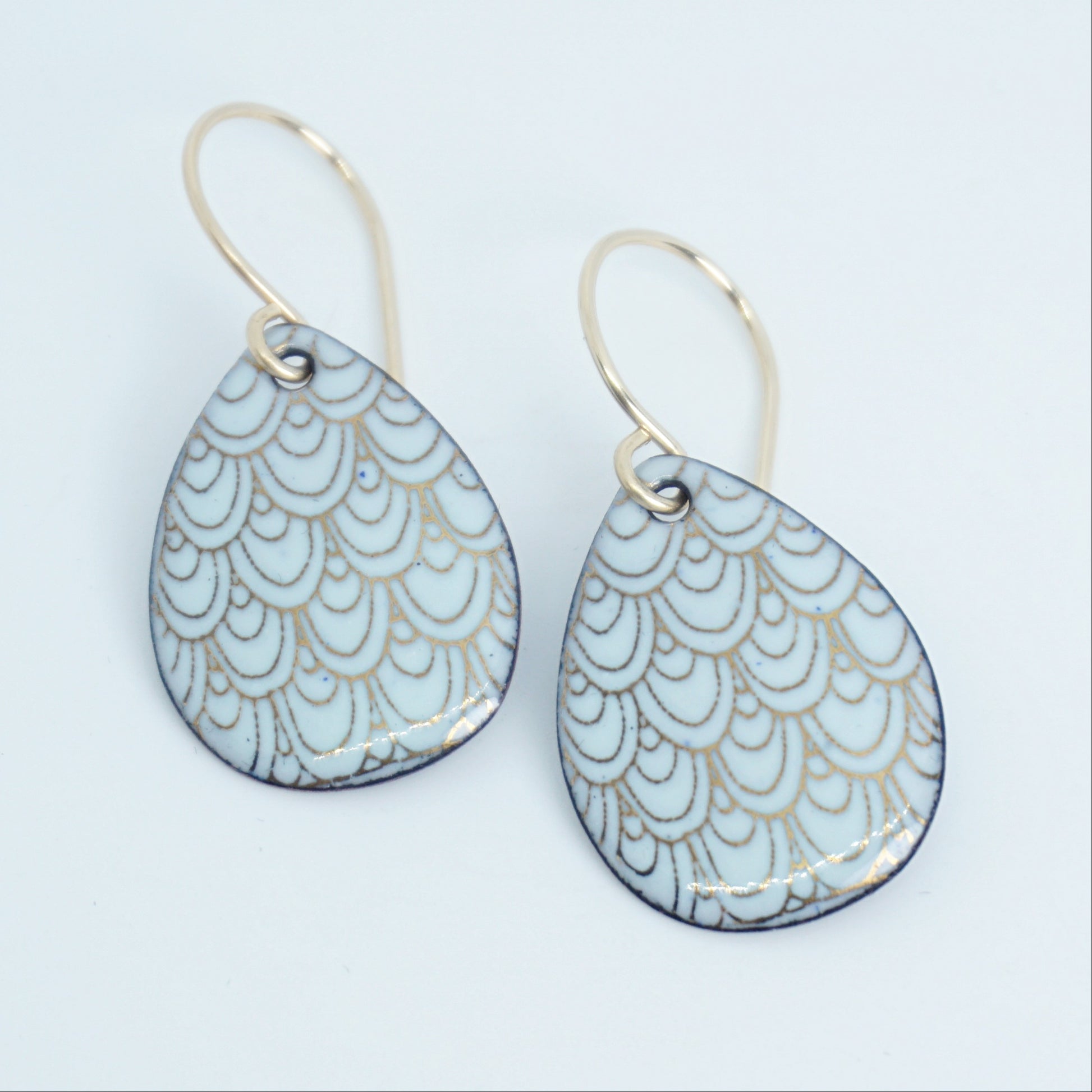 To create these earrings, I hand cut and dome the copper blanks. I then fire lead free vitreous enamel in a kiln to over 1500°. The design is achieved using kiln fired enamel decals. Multiple layers, techniques, and firings are necessary to achieve the look of these earrings.