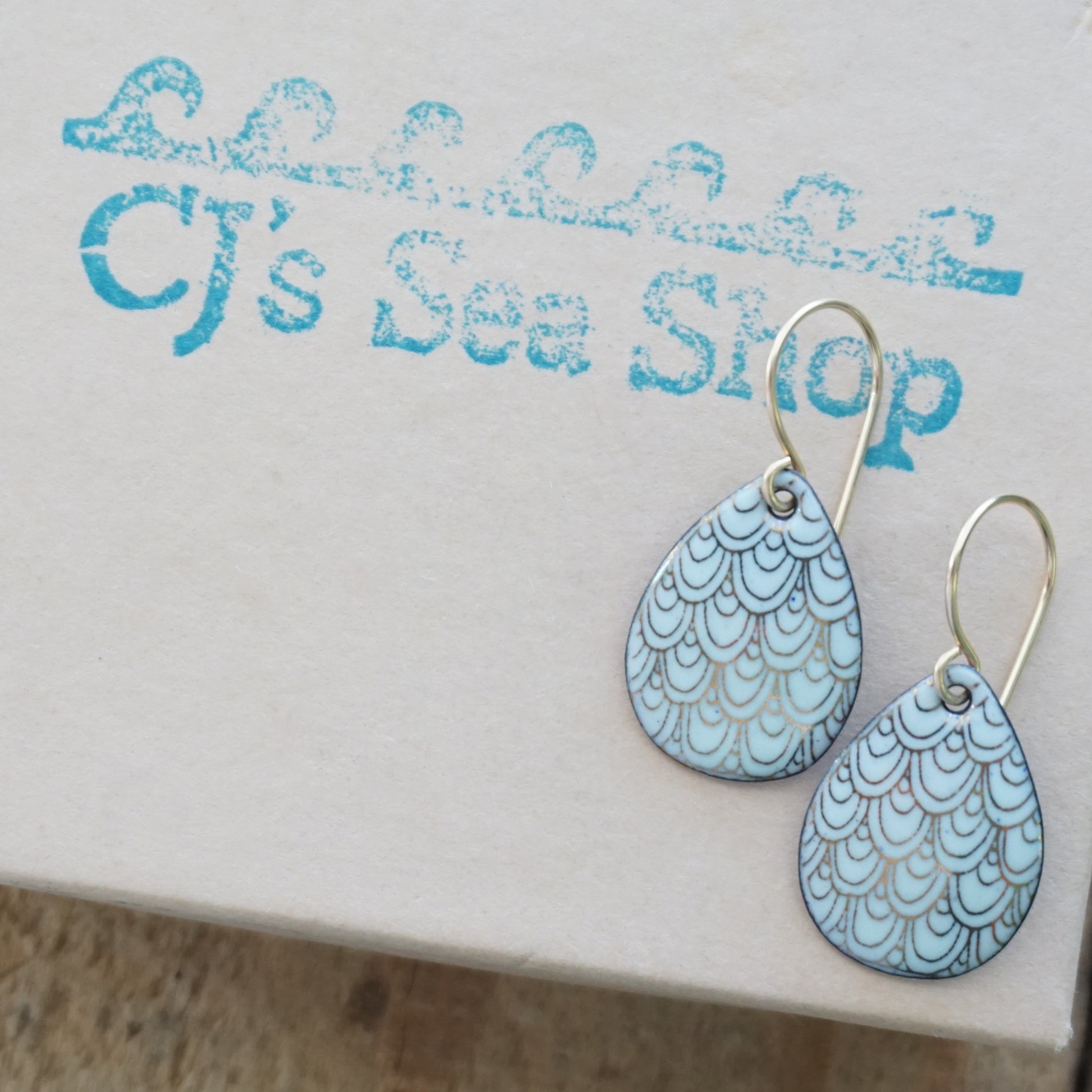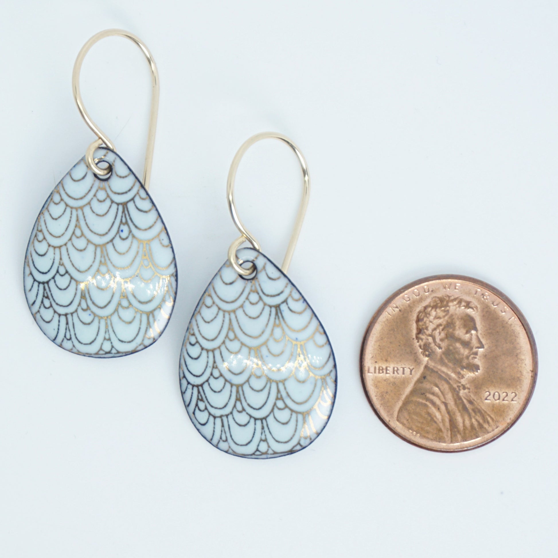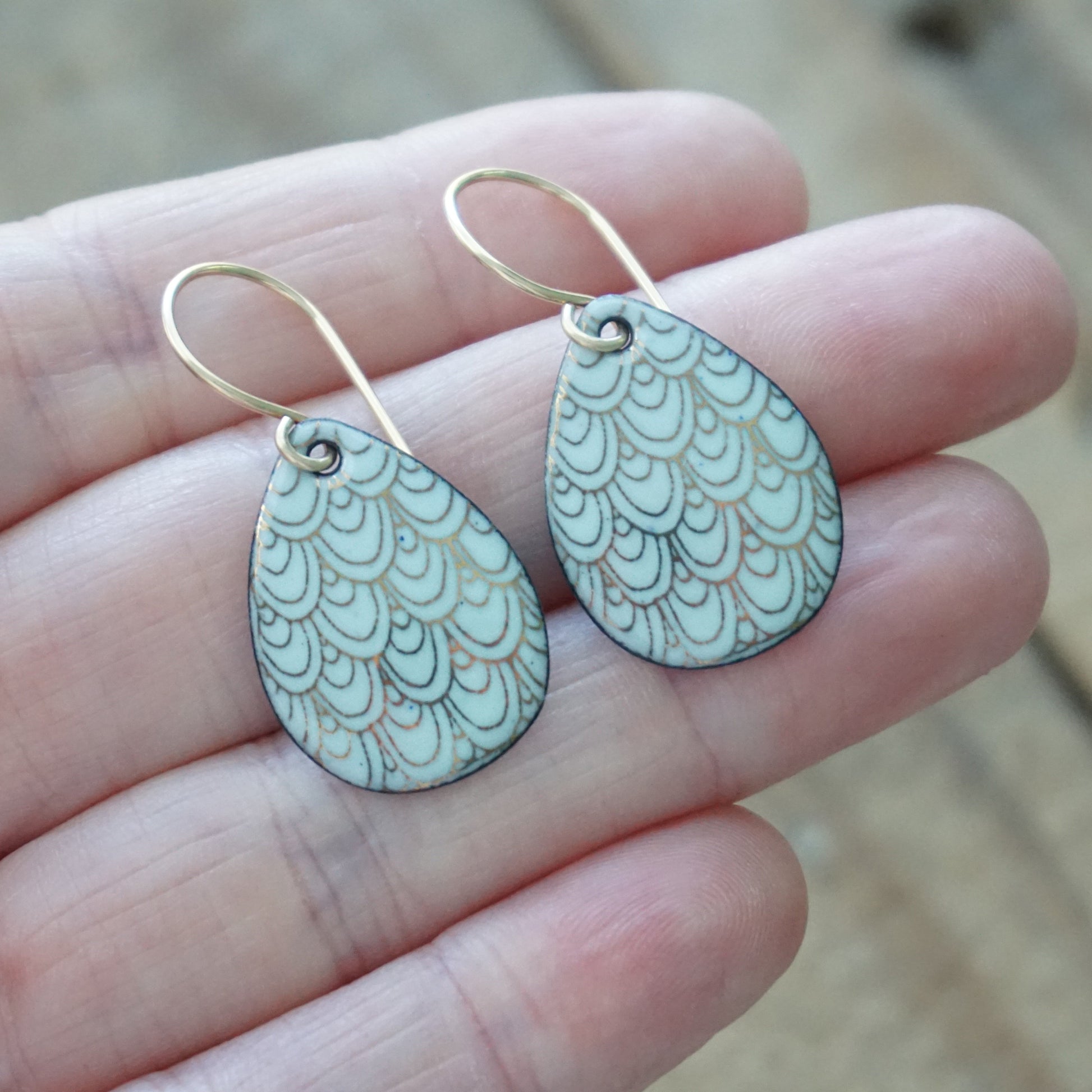 Gold mermaid scales on light seafoam green enamel teardrop earrings.