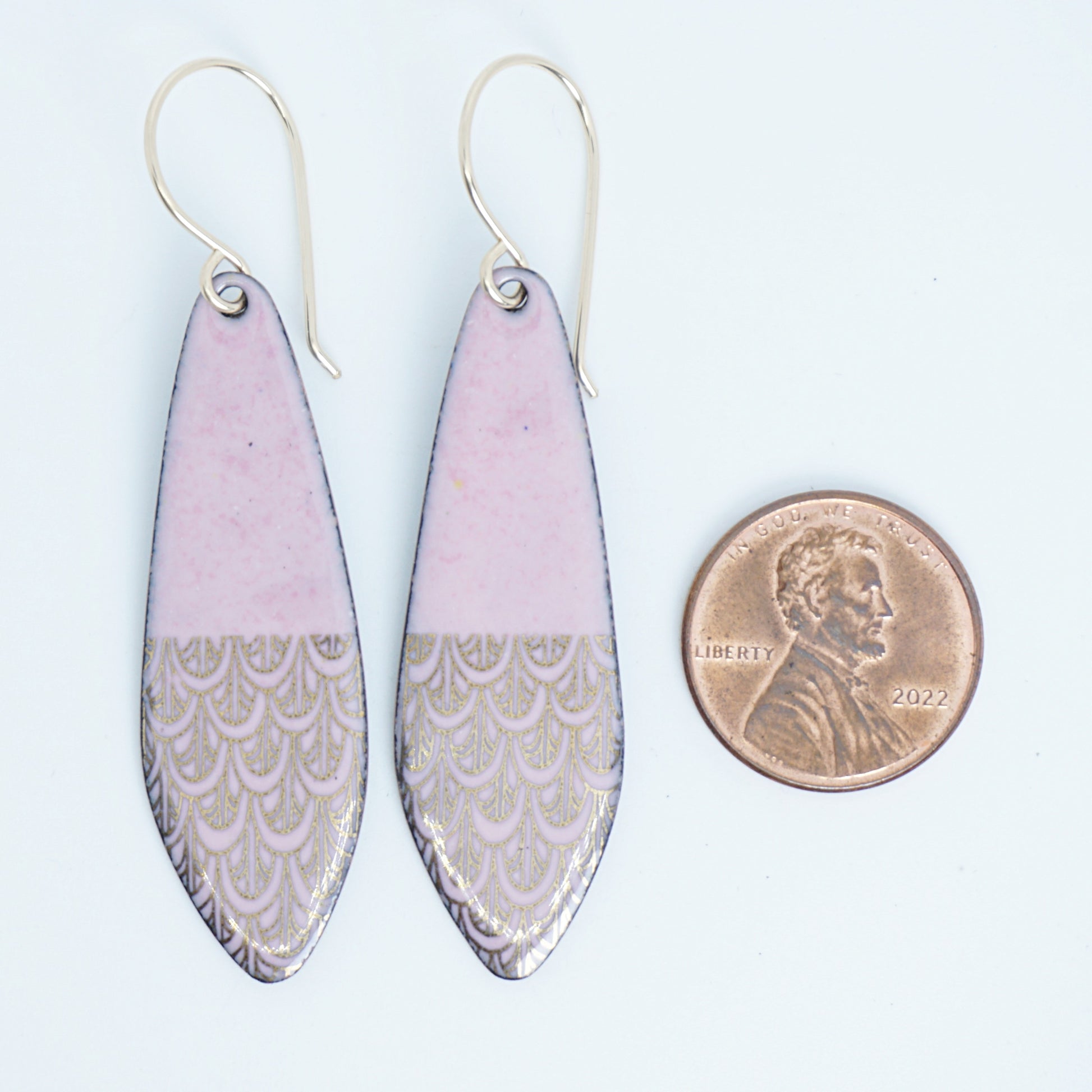 Gold mermaid scales print on pink enamel teardrop earrings. Yellow gold filled ear wires.