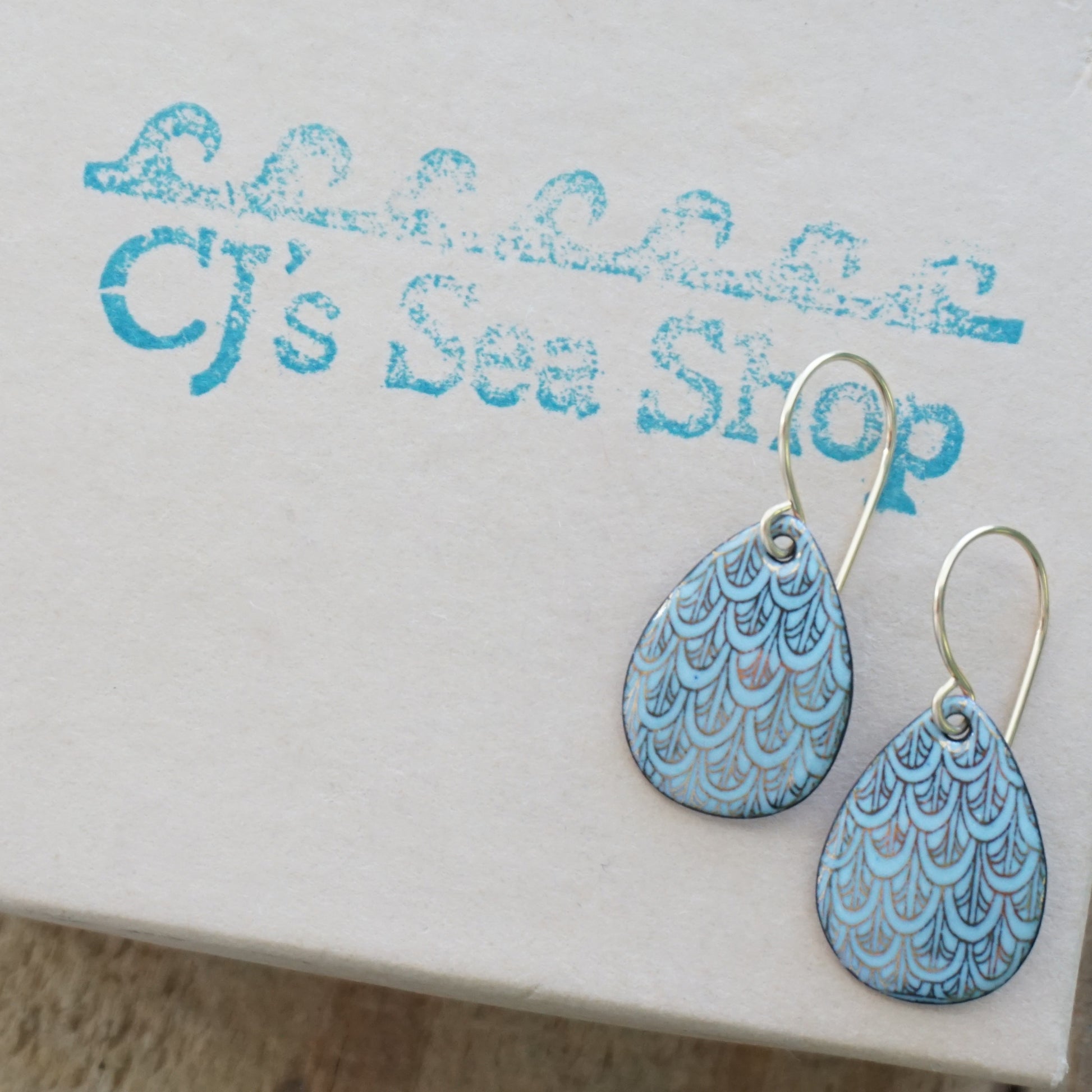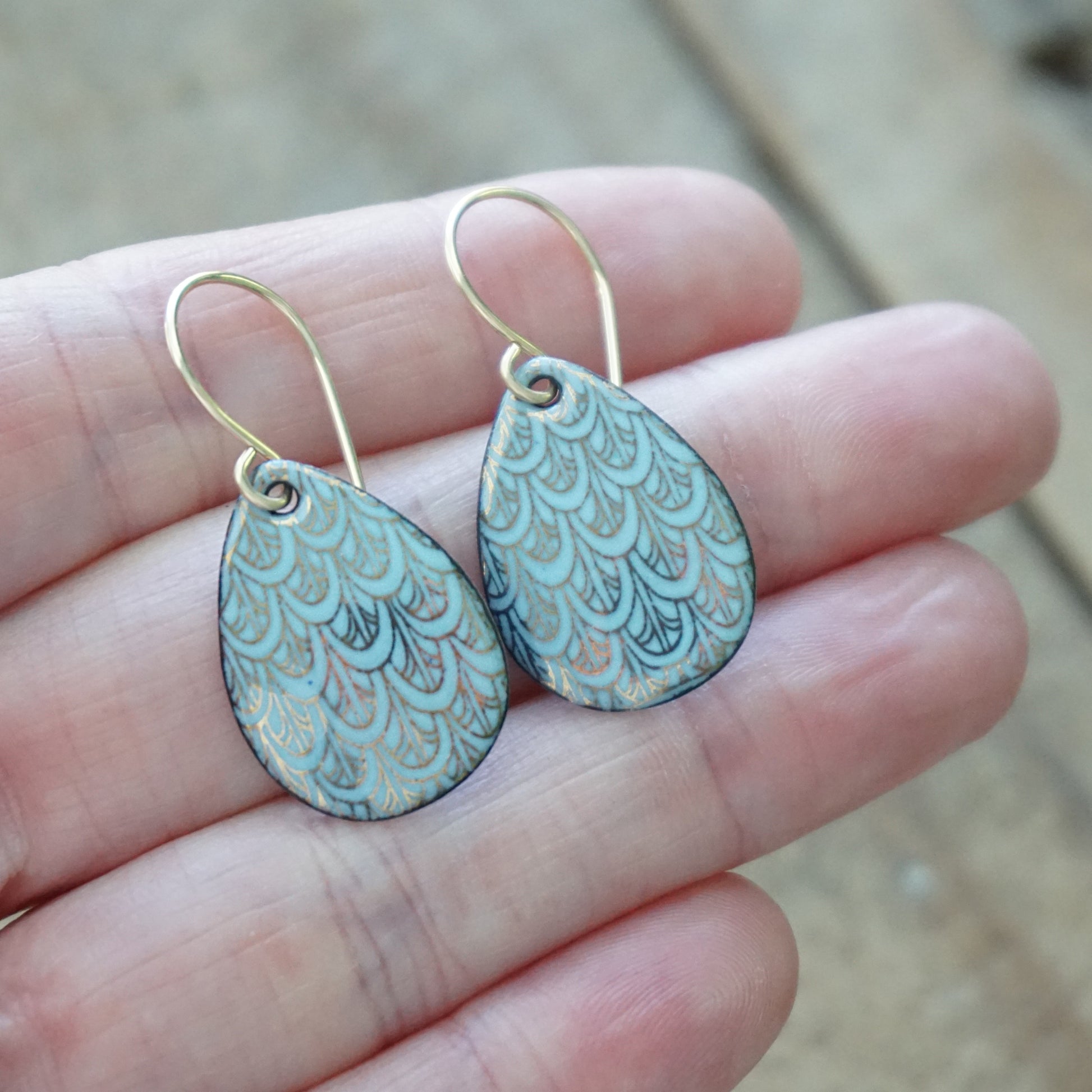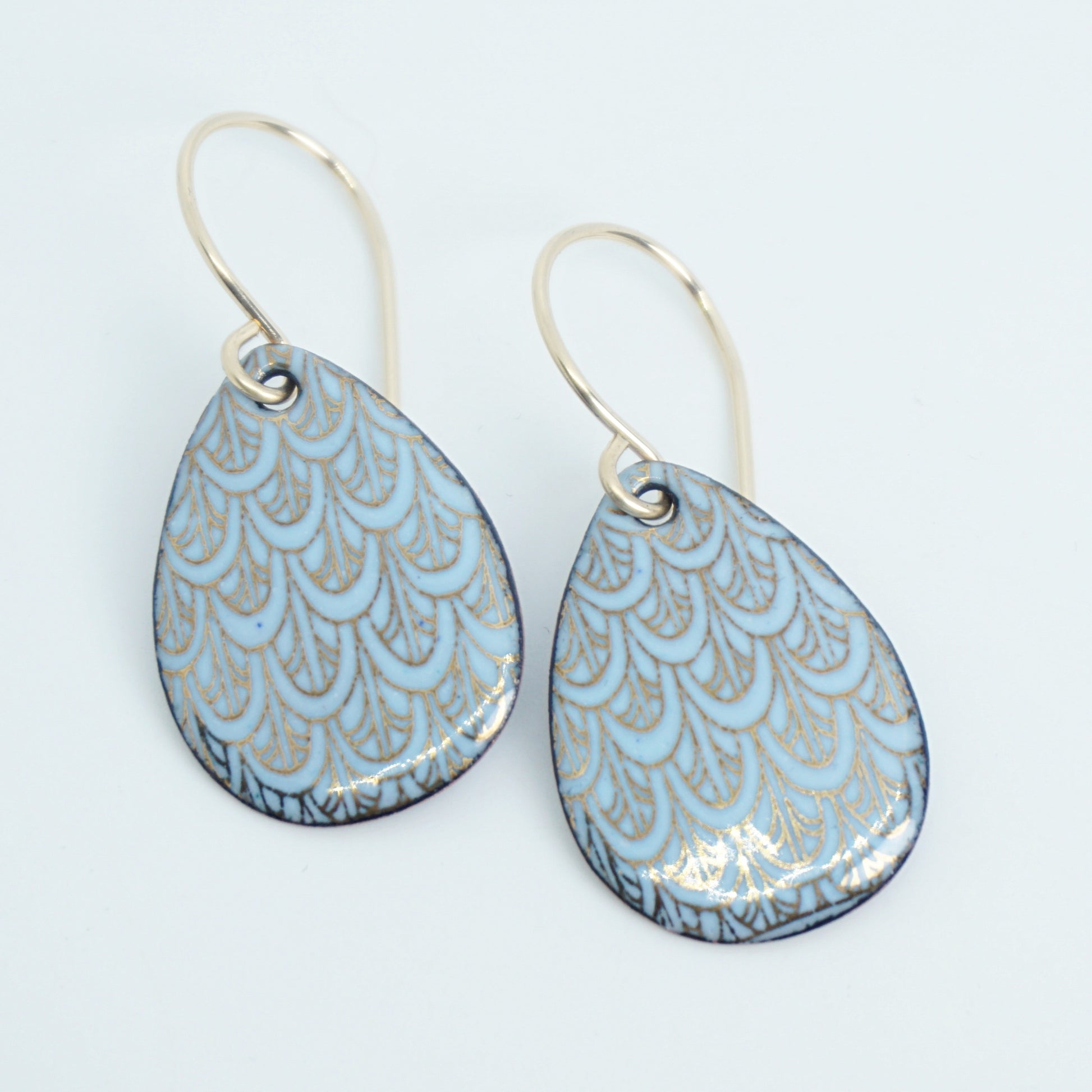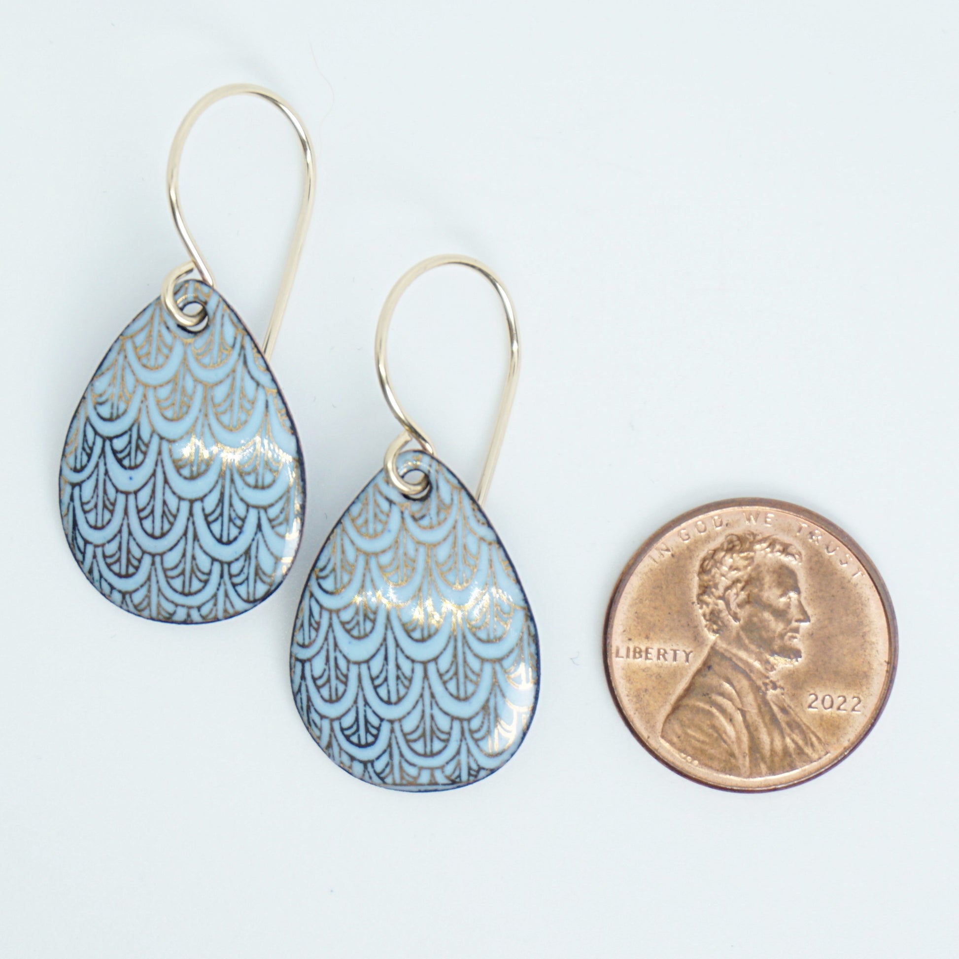Gold mermaid scales on light blue enamel teardrop earrings.