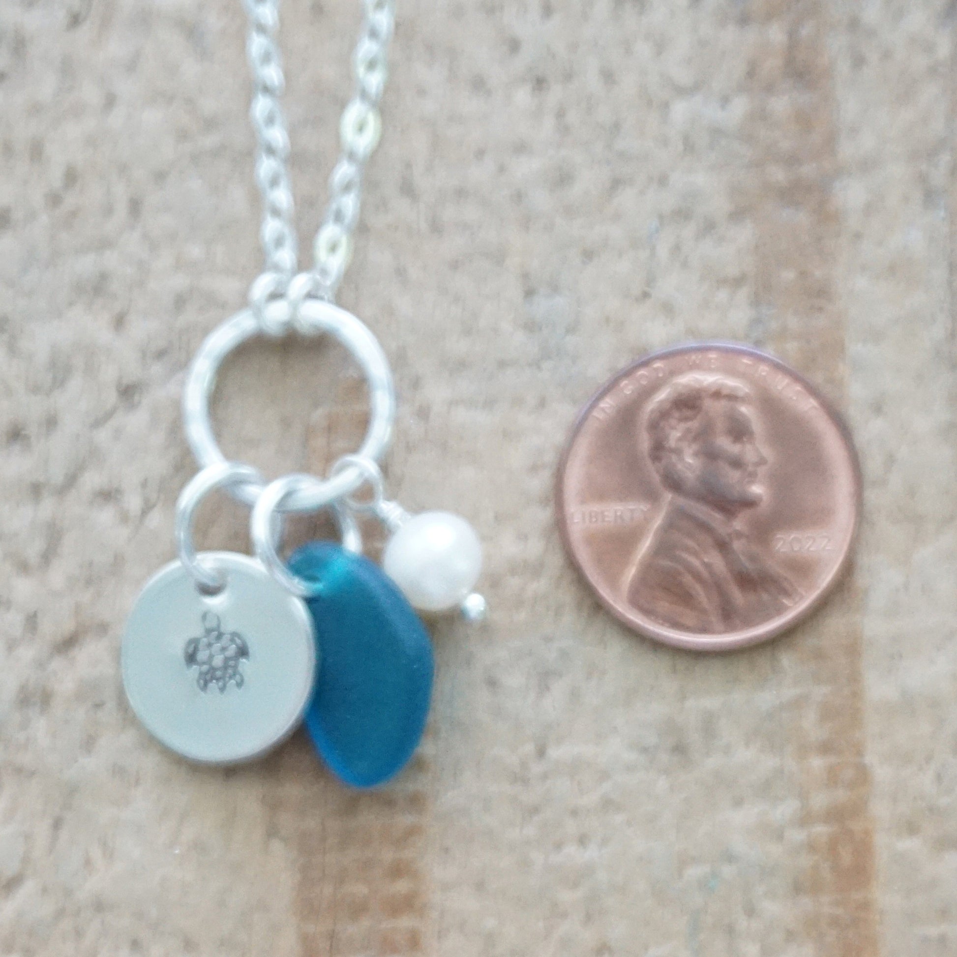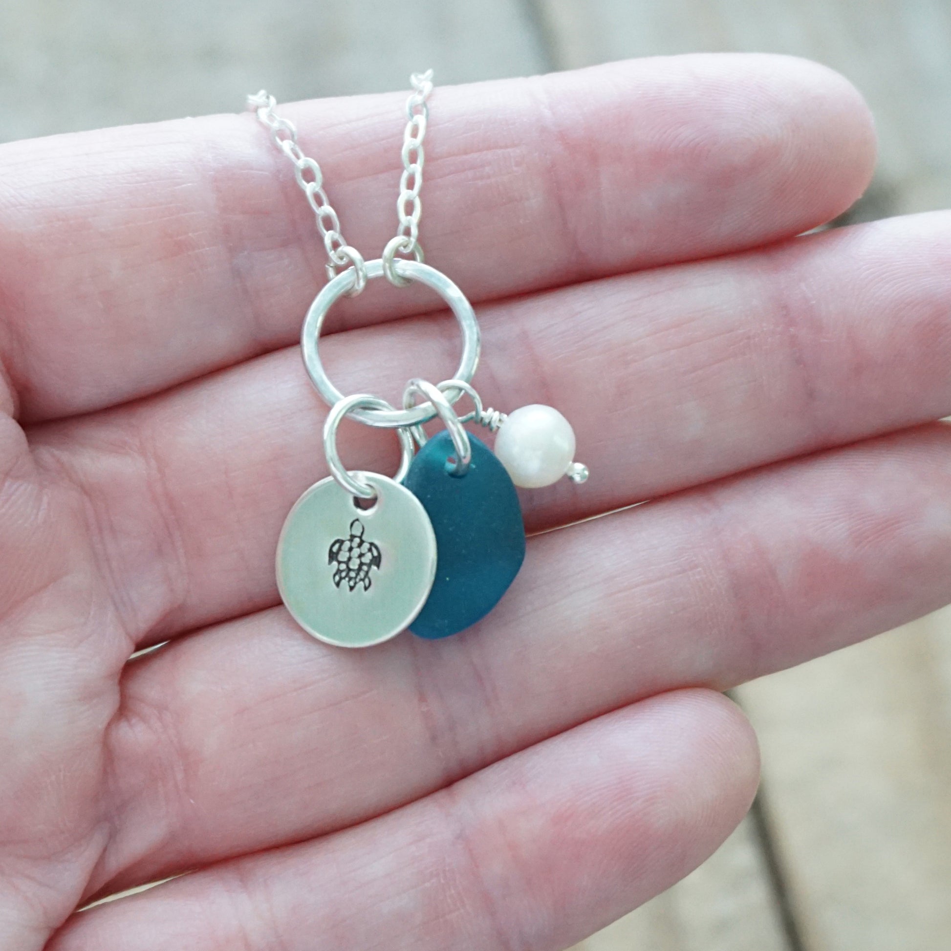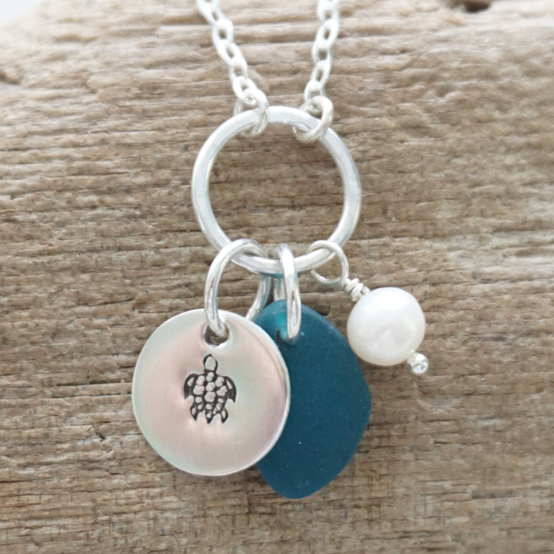 Hand Stamped Turtle Charm Necklace with Sea Glass and Freshwater Pearl